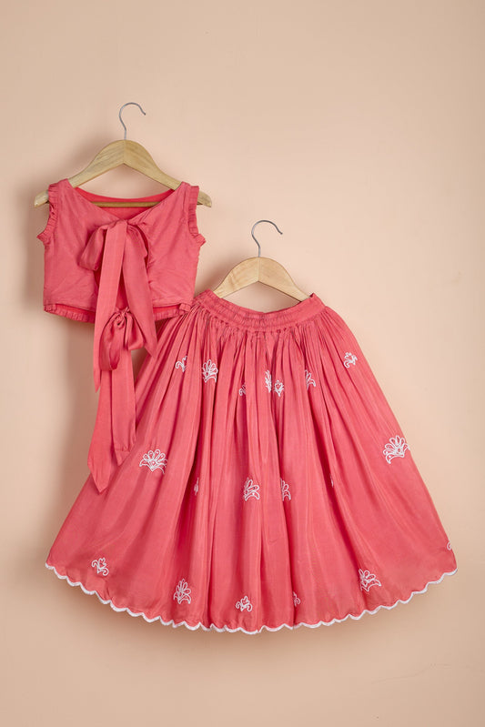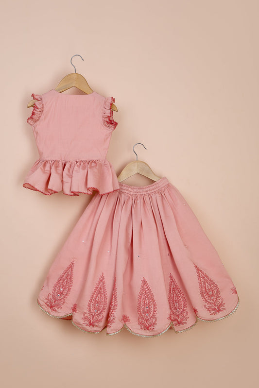 Gillie Floral Embroidered Stylish Back Pink Top And Lehenga