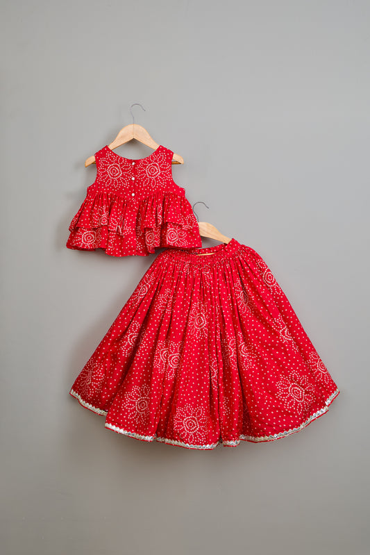 Red Printed Embroidered Layered Top And Flared Lehenga