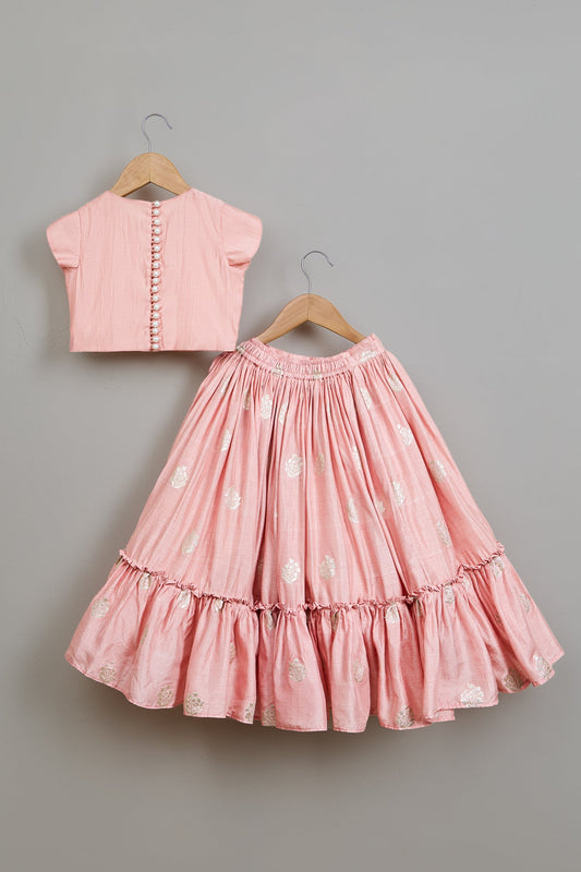 Kanji Embellished Embroidered Pink Top And Brocade Lehenga