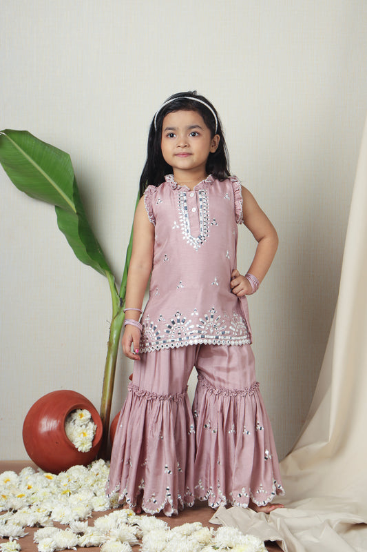 Pink Faux Mirror Embroidered Ruffle Detailed Kurti With Sharara