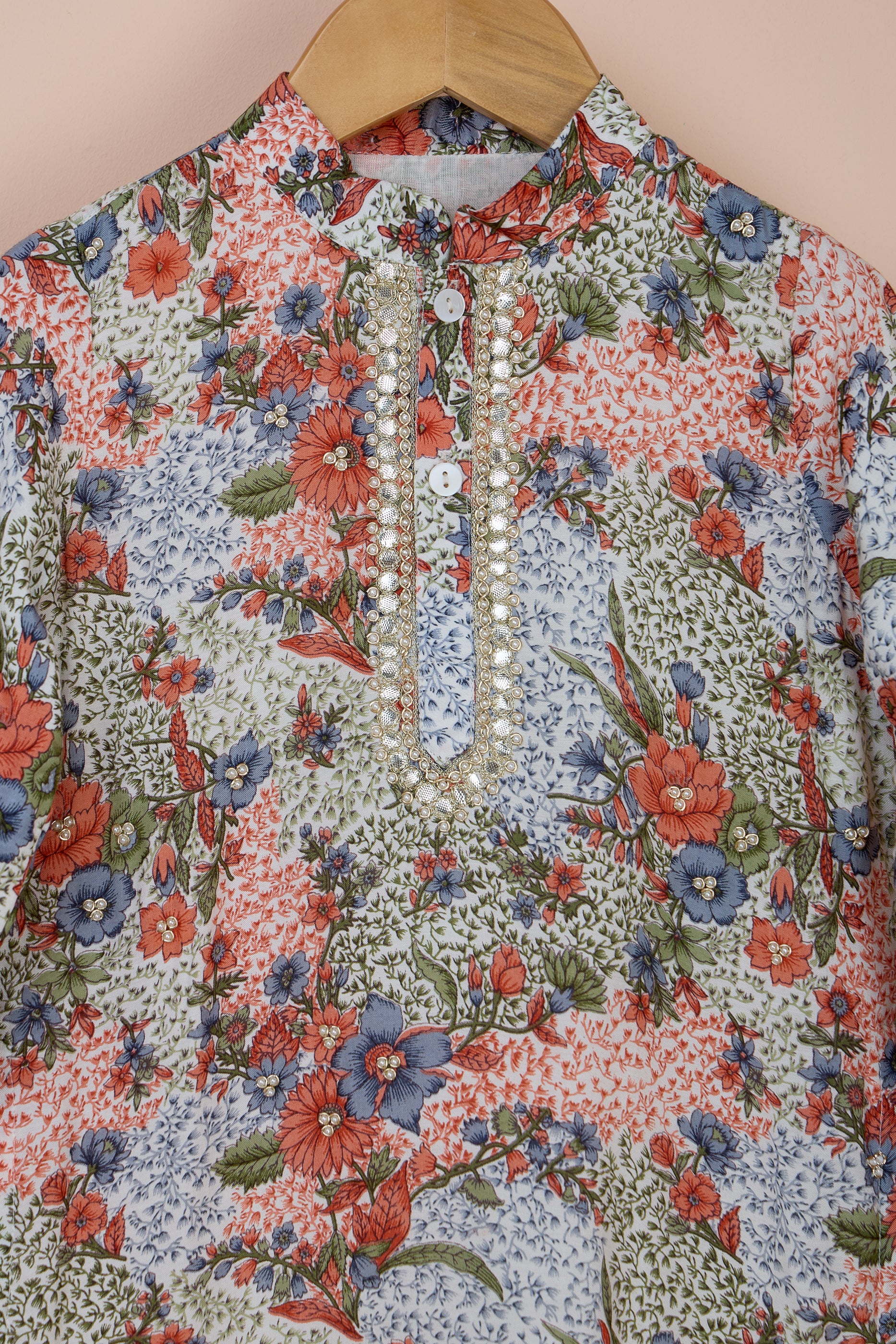 This multicolor floral-printed kurta features a mandarin collar, front buttons, and side slits, beautifully embellished with gota lace, thread, and tiny pearl hand embroidery. Paired with a printed pajama with an elasticated waist.