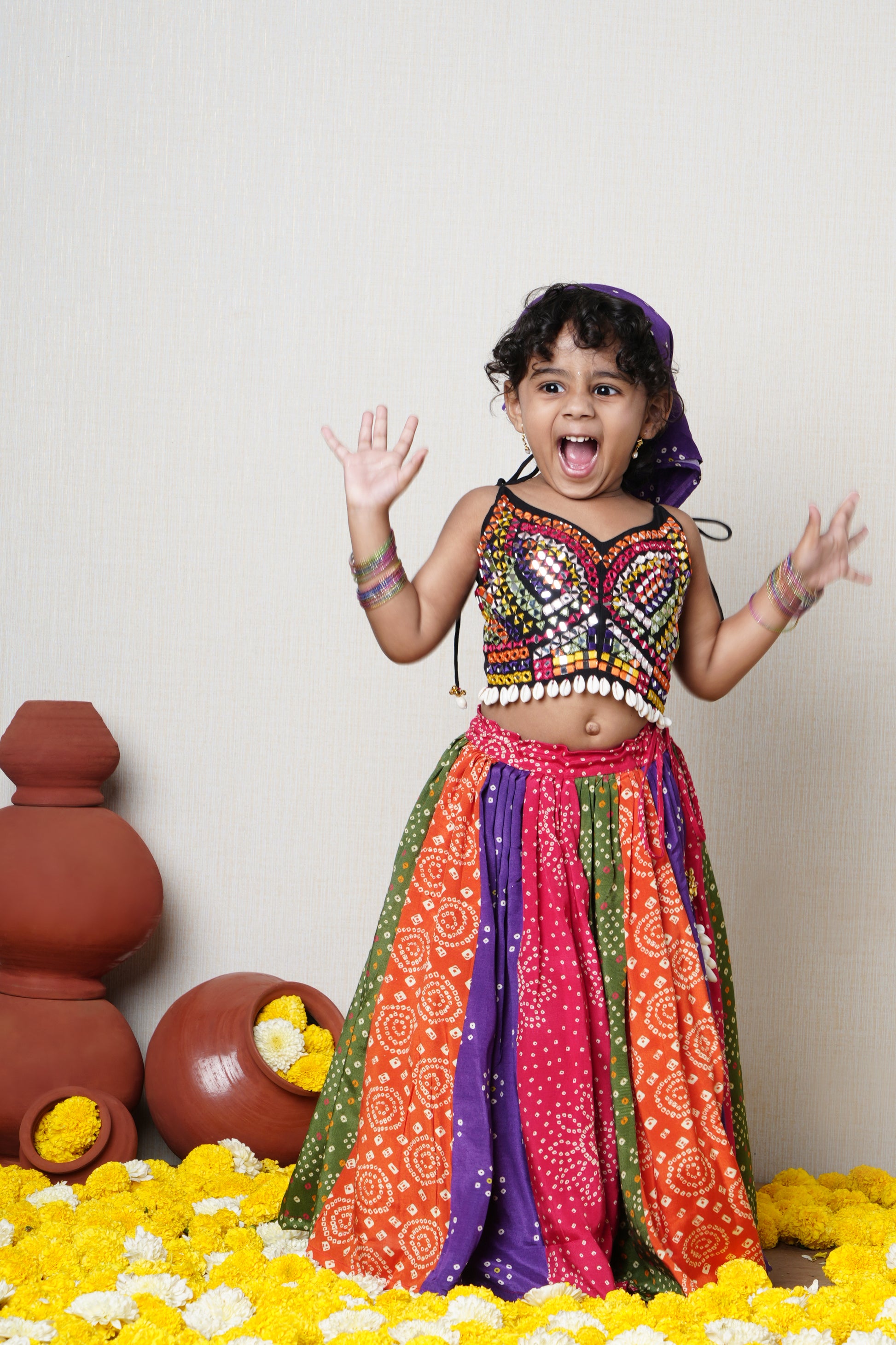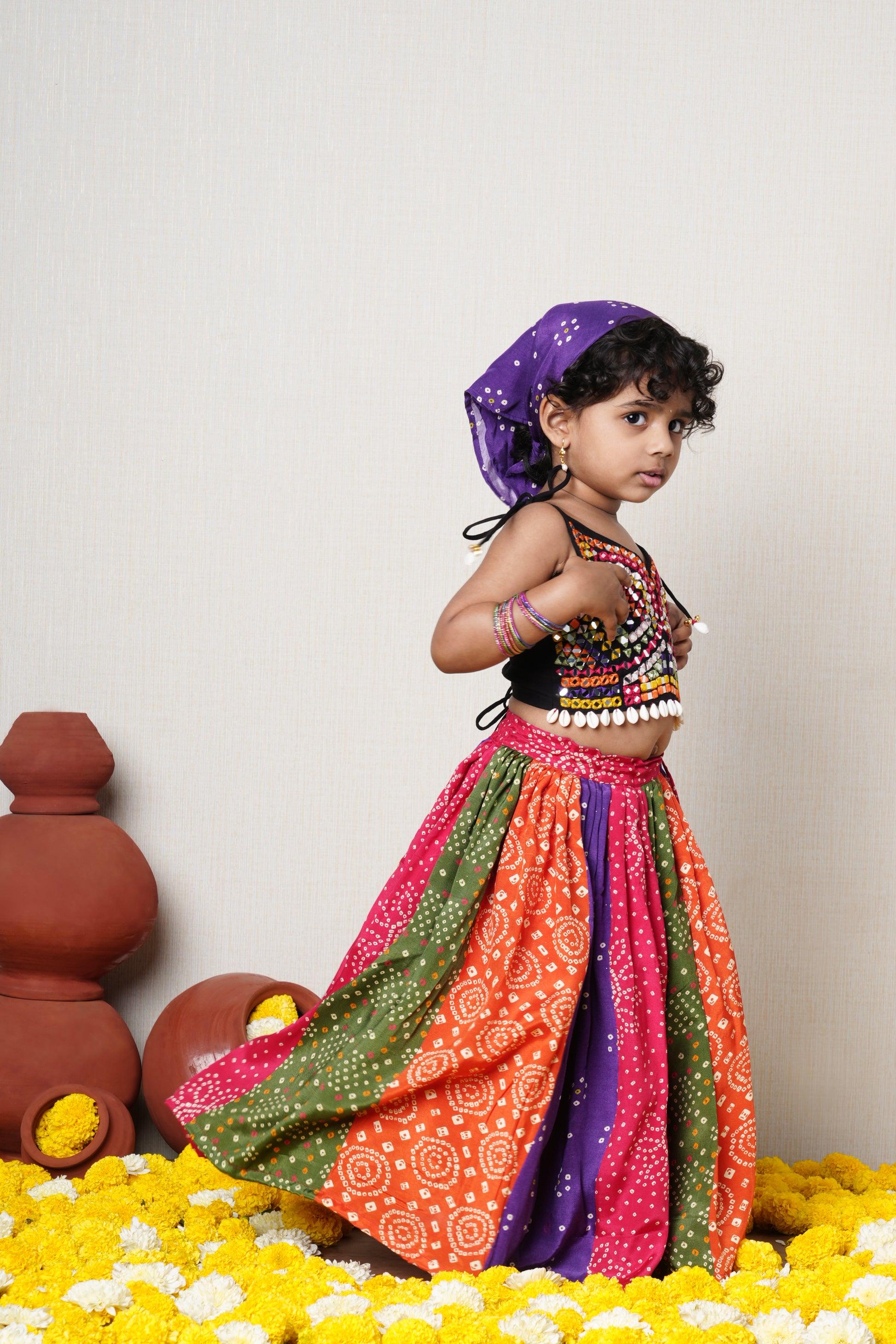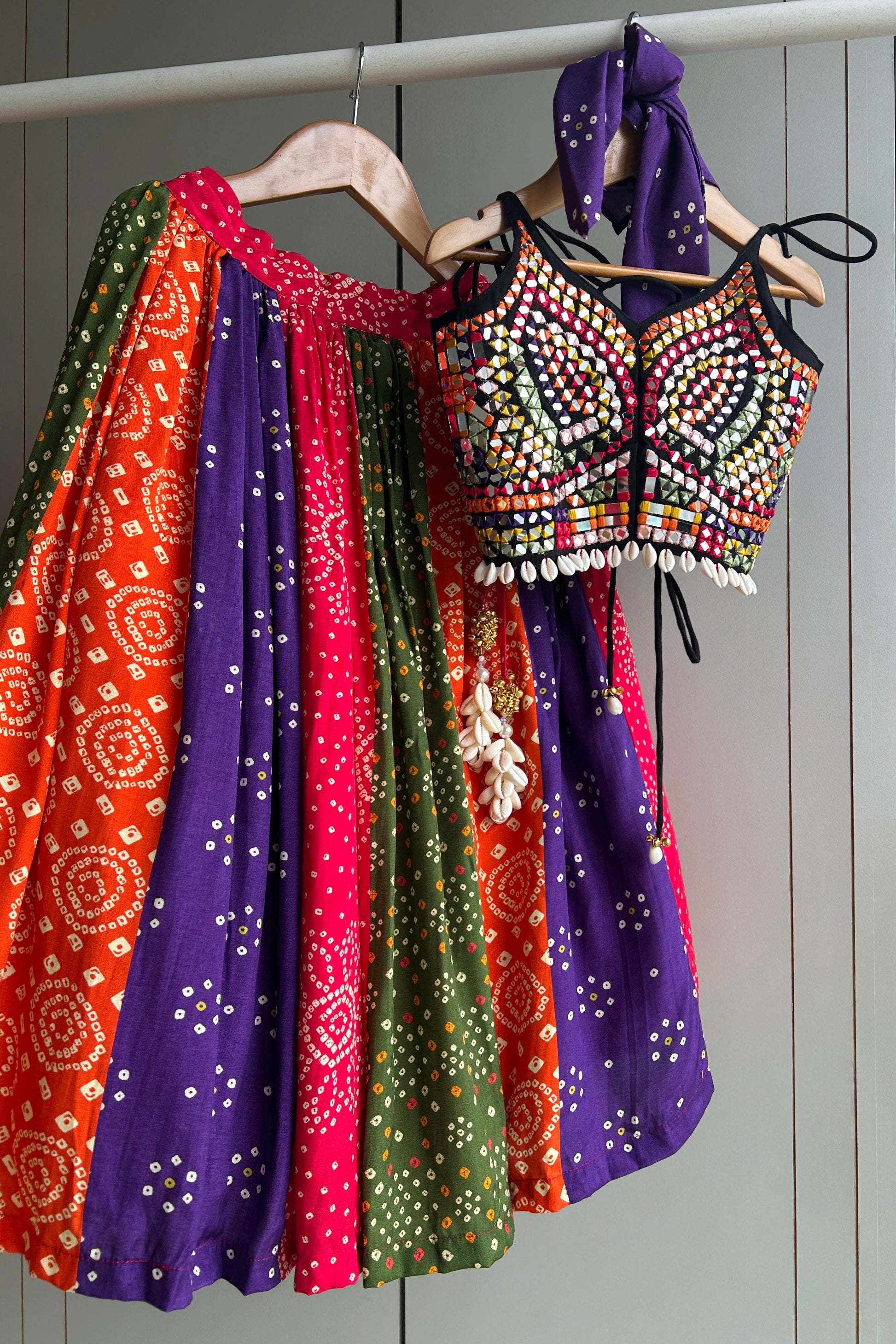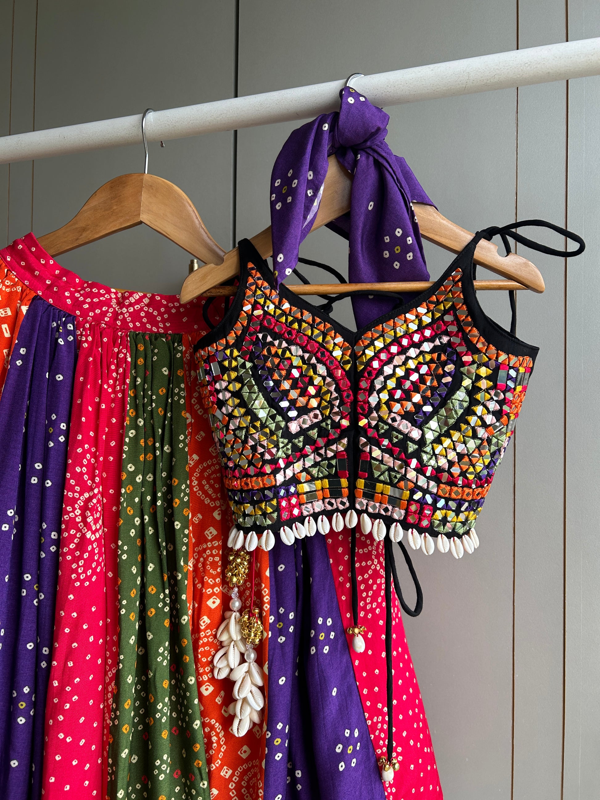 Strappy top with multicolour thread and mirror hand embroidery, finished with cowrie shell detailing. Tie-up shoulder strings and criss-cross back tie-ups adorned with ghungroos and cowrie shells. Paired with a multicolour bandhani printed lehenga featuring an elasticated back waist, hook & zip closure, adjustable drawstrings with cowrie tassels, and a purple bandhani printed bandana.