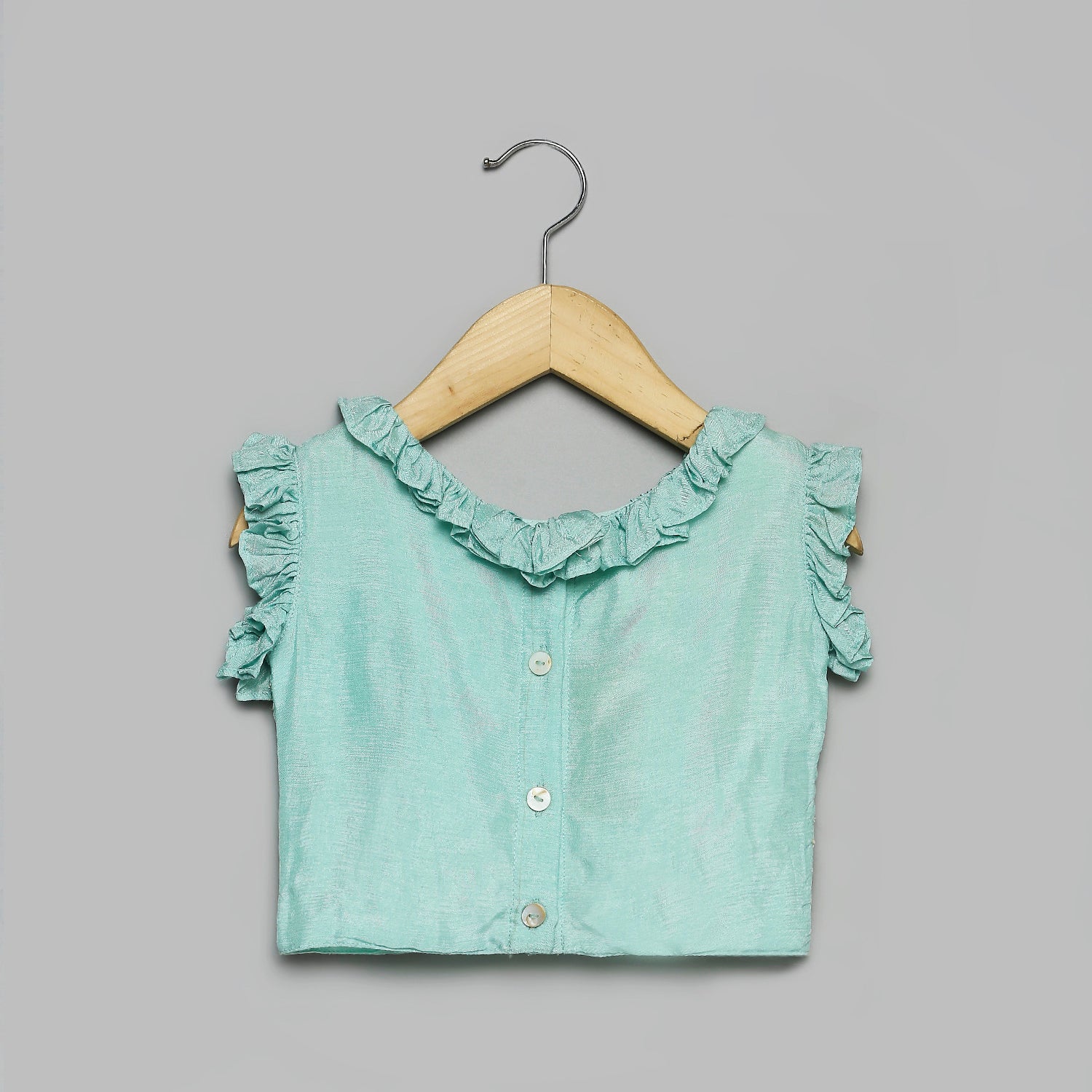 Featuring ruffles around the neckline and armholes, a stylish cut-out hem, and a back button closure