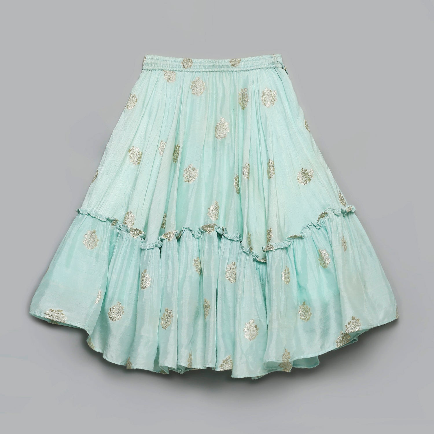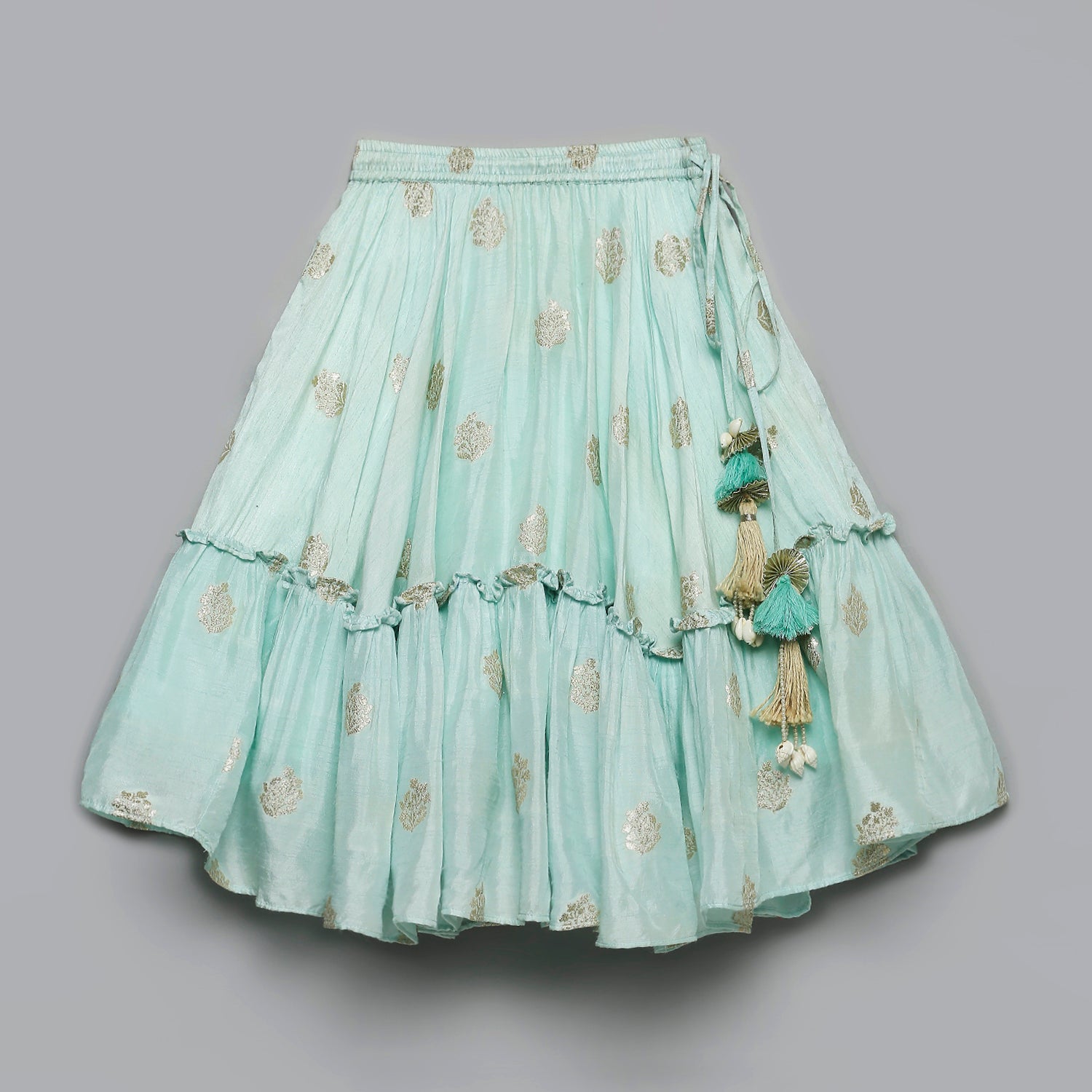 Lehenga with an elasticated waist with an adjustable drawstring, adorned with gota flower tassels, and embroidered with pleat detailing