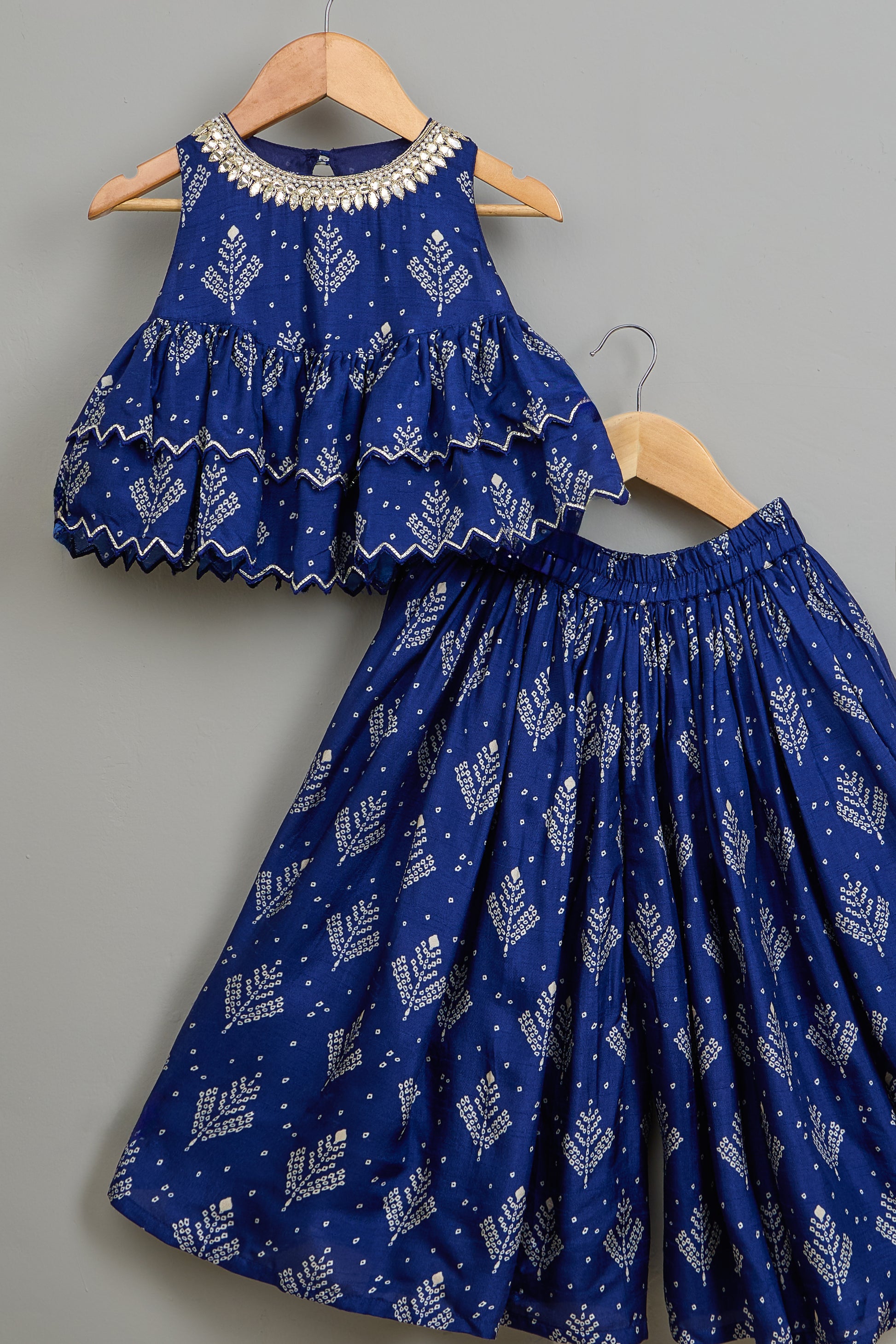 Blue printed layered top with a scalloped hem, featuring gota lace, thread work, and pearl embroidery on the neckline. Finished with a flared silhouette and pearl loop button closure at the back. Paired with matching flared palazzos with an elasticated waist. Note: Print placement may vary as each piece is unique.