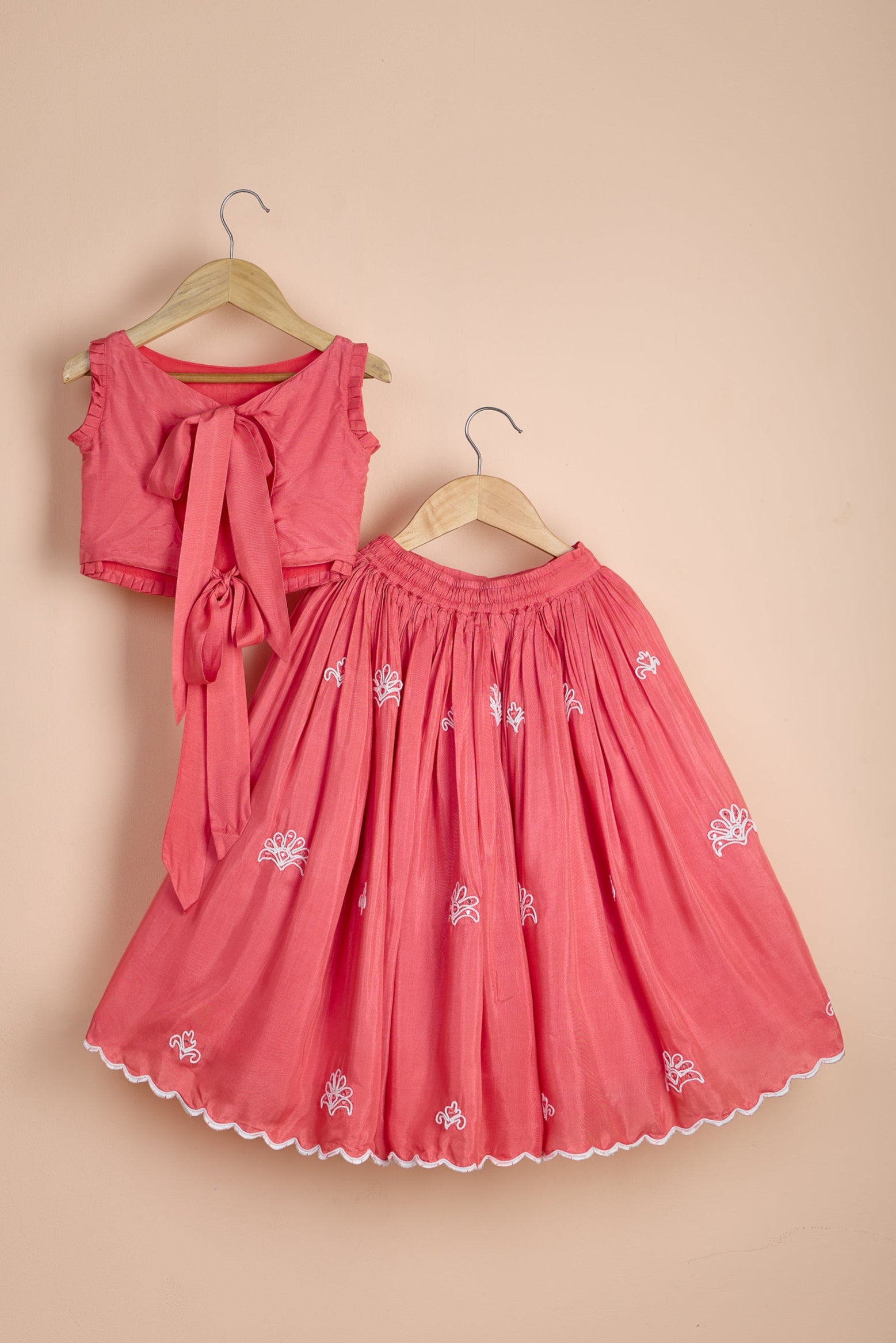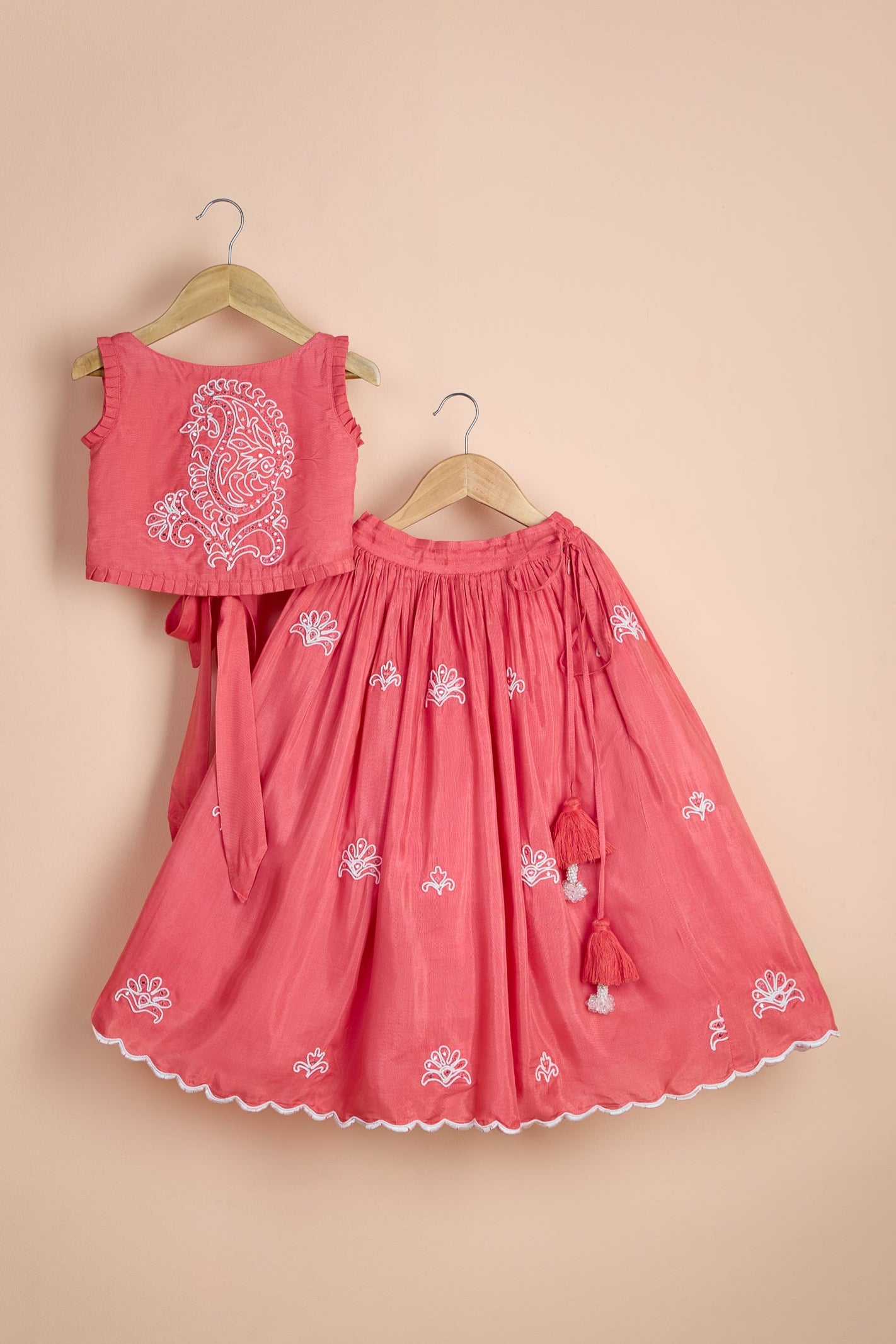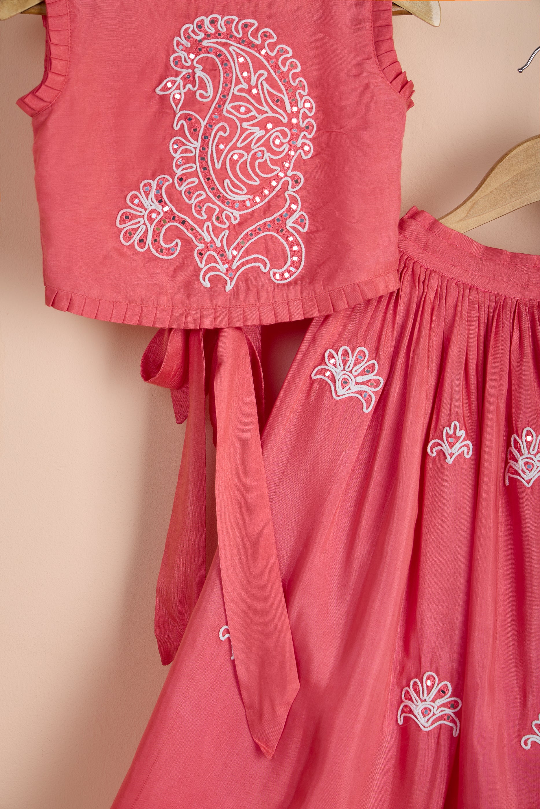 Sleeveless top and lehenga with dori embroidery and faux mirror work. The top features pleated armholes, pleated hem, and dual tie-back knots. The lehenga has an elasticated back waist, adjustable drawstring with fringe tassels, side zip and hook closure, and a scalloped hem. Designed with a boat neck and can-can and cotton lining.