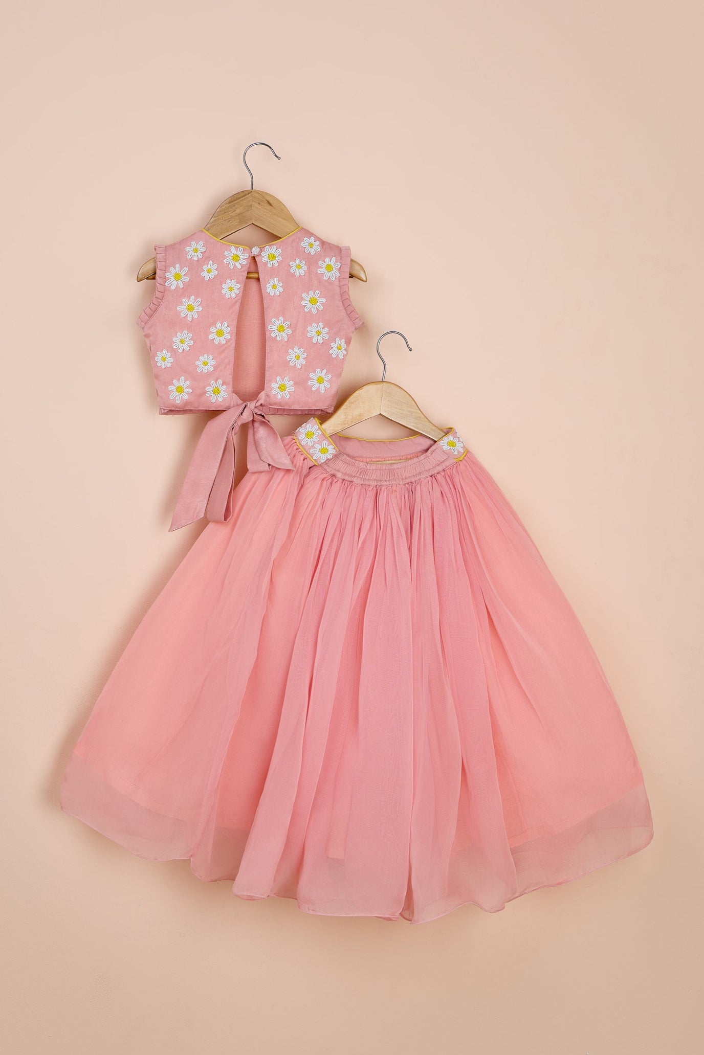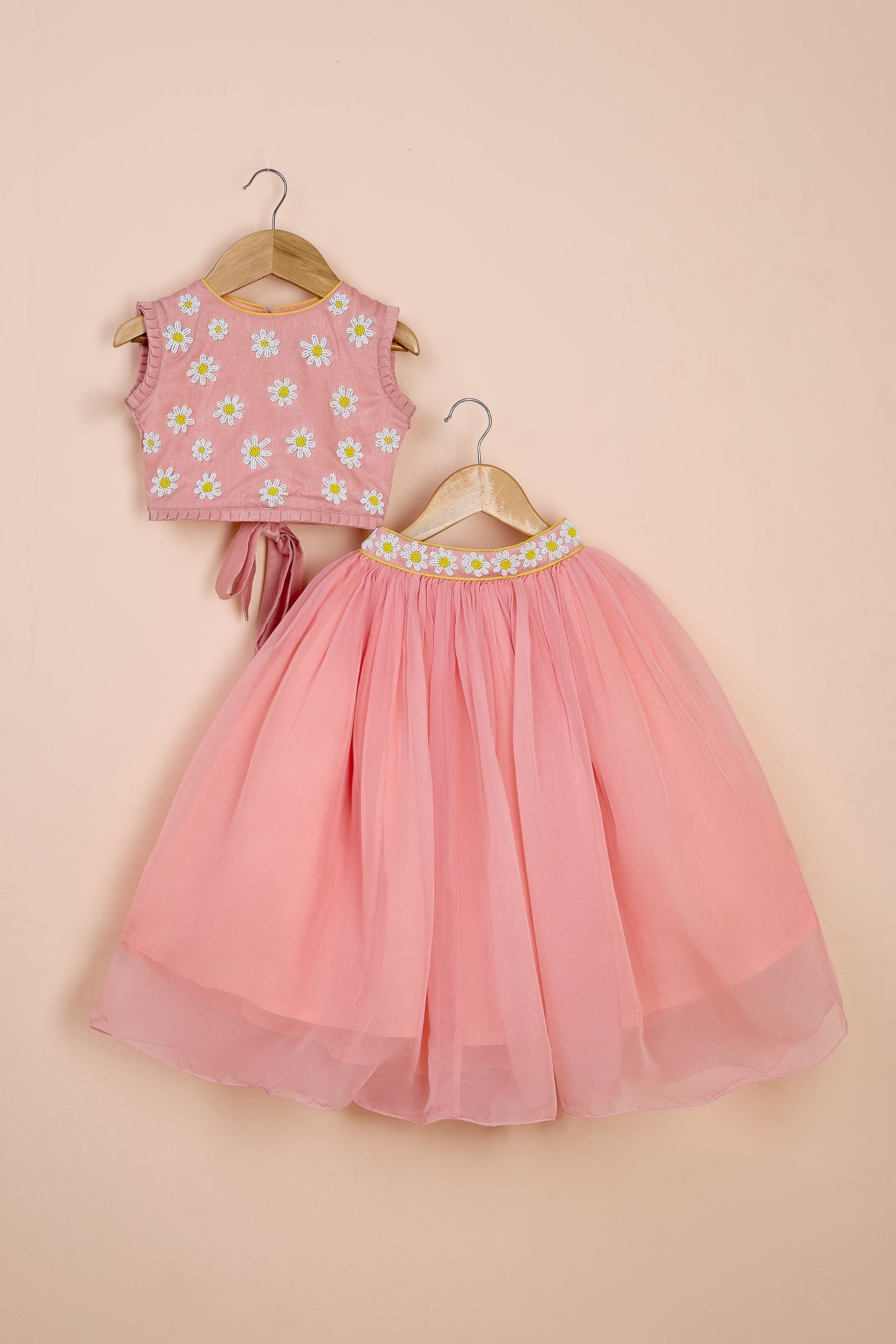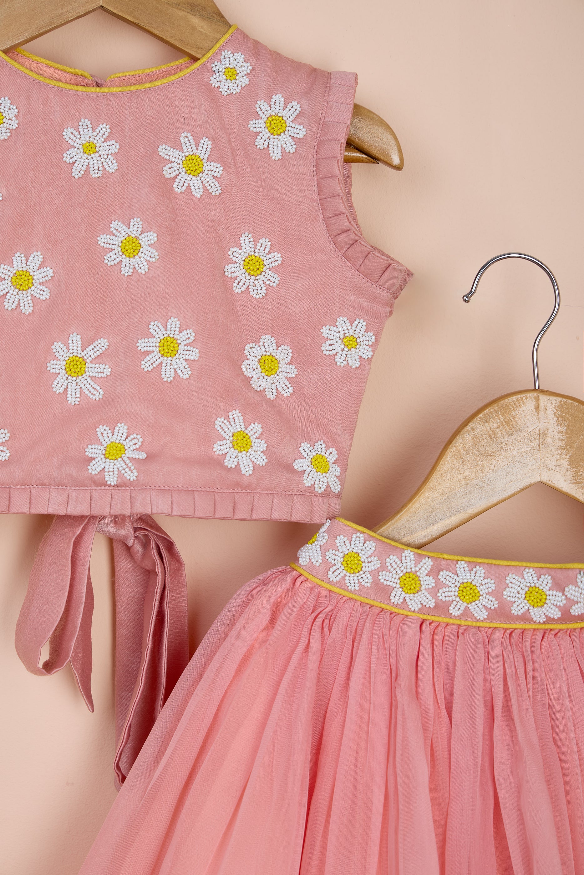Floral embroidered top with beadwork, pleated armholes, and hem. Features a round neck, button closure, and tie-up knot at the back. Flared lehenga with elastic at the back, side hook and zip closure. Lehenga belt embellished with floral bead embroidery at the front. Includes can-can and cotton lining.