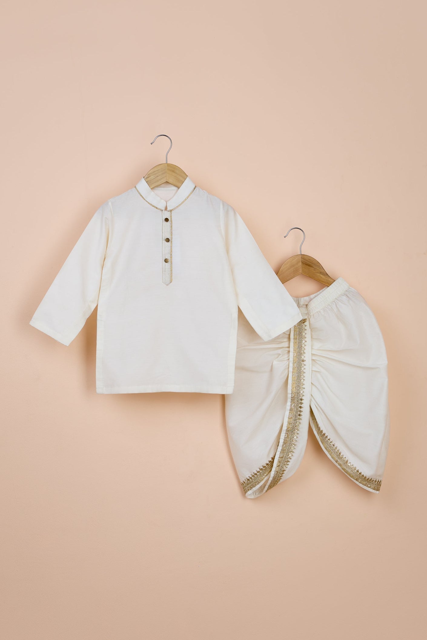 A classic set featuring a plain kurta with front hook panel and piping detail, paired with a jacket with a cutout hem and attached pocket square. Completed with an elasticated dhoti with lacework at the front and back. Product Information: