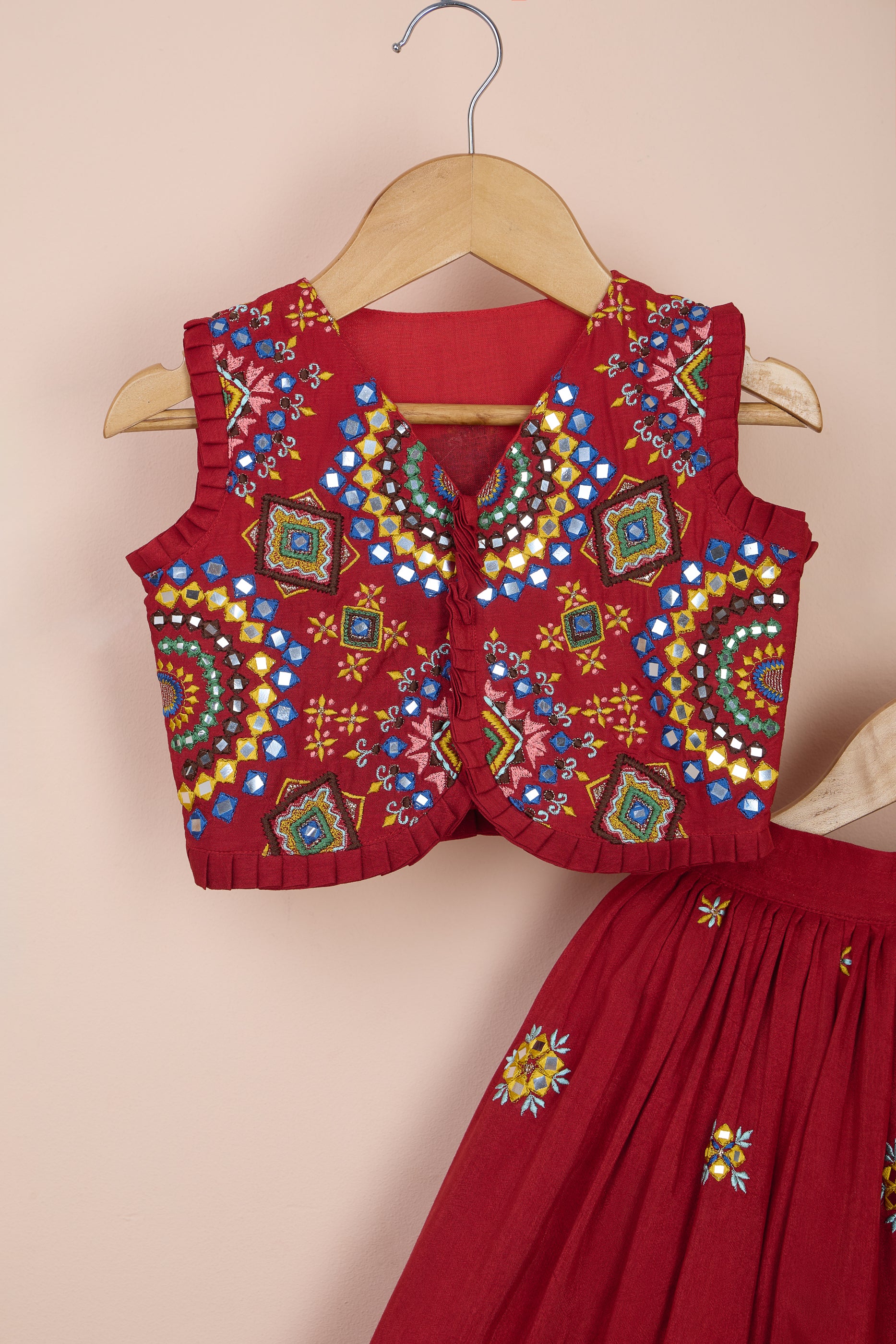 Padmini Red Embroidered Blue Top And Flared Lehenga