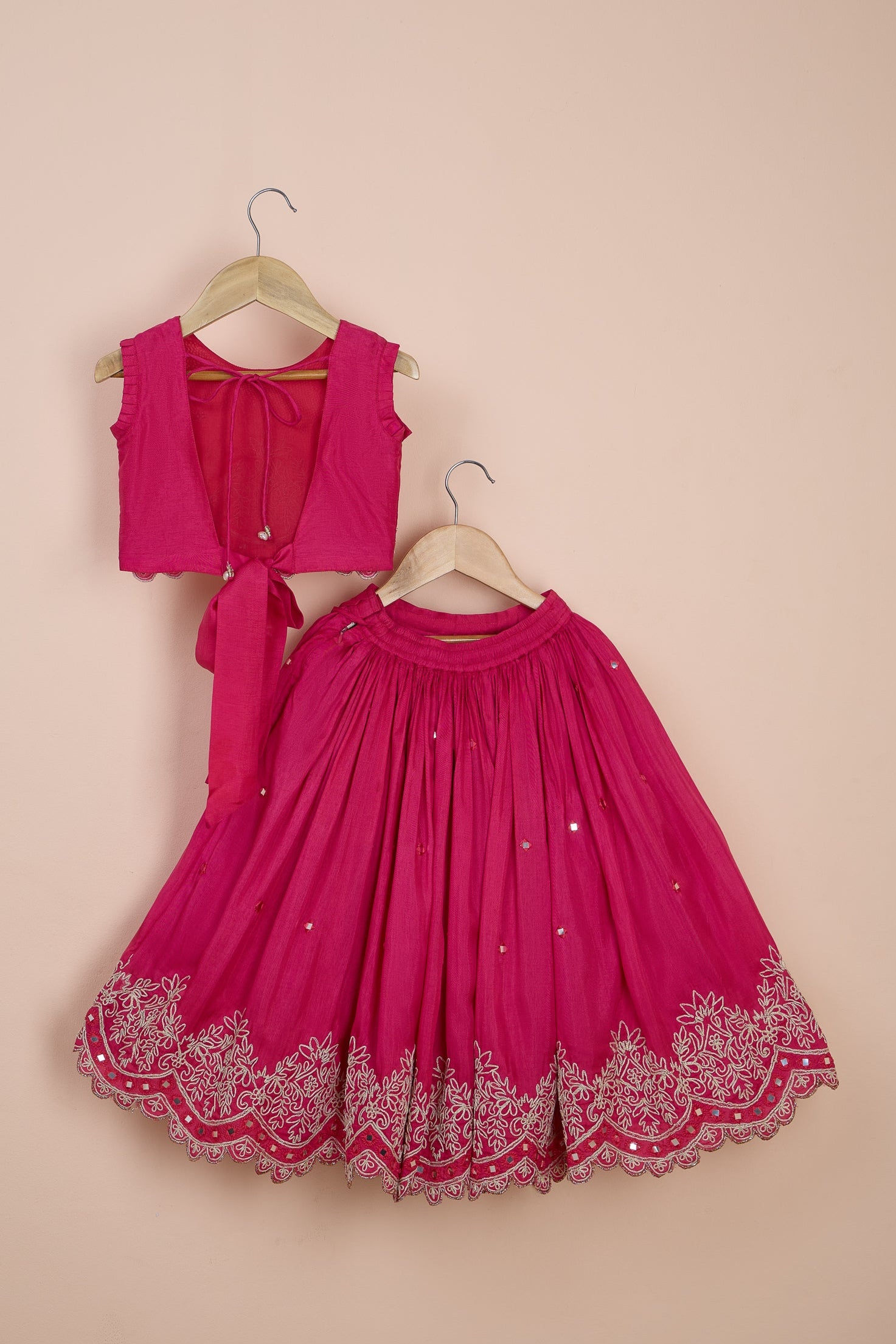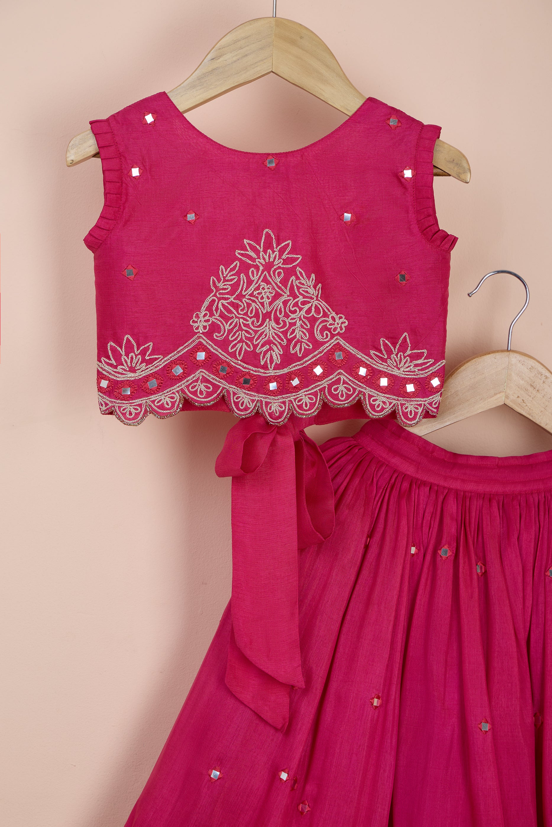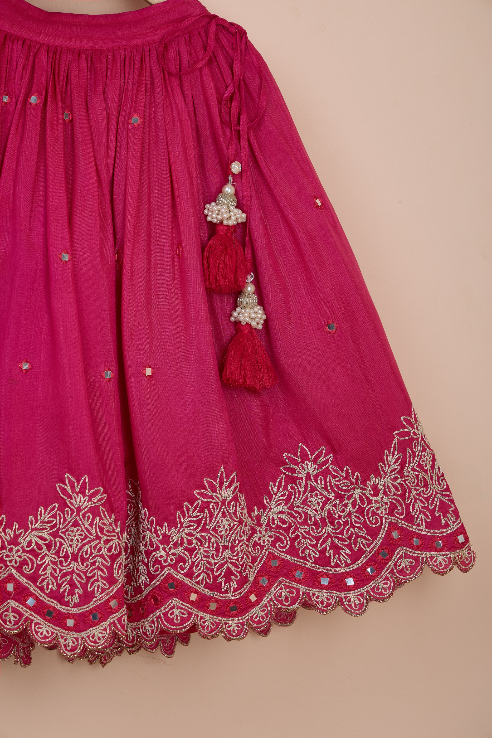 Featuring a tie-up fuchsia blouse for girls in viscose silk base with dori and faux mirror embroidery. It is paired with an embroidered lehenga having an elasticated back and decorative tassels..