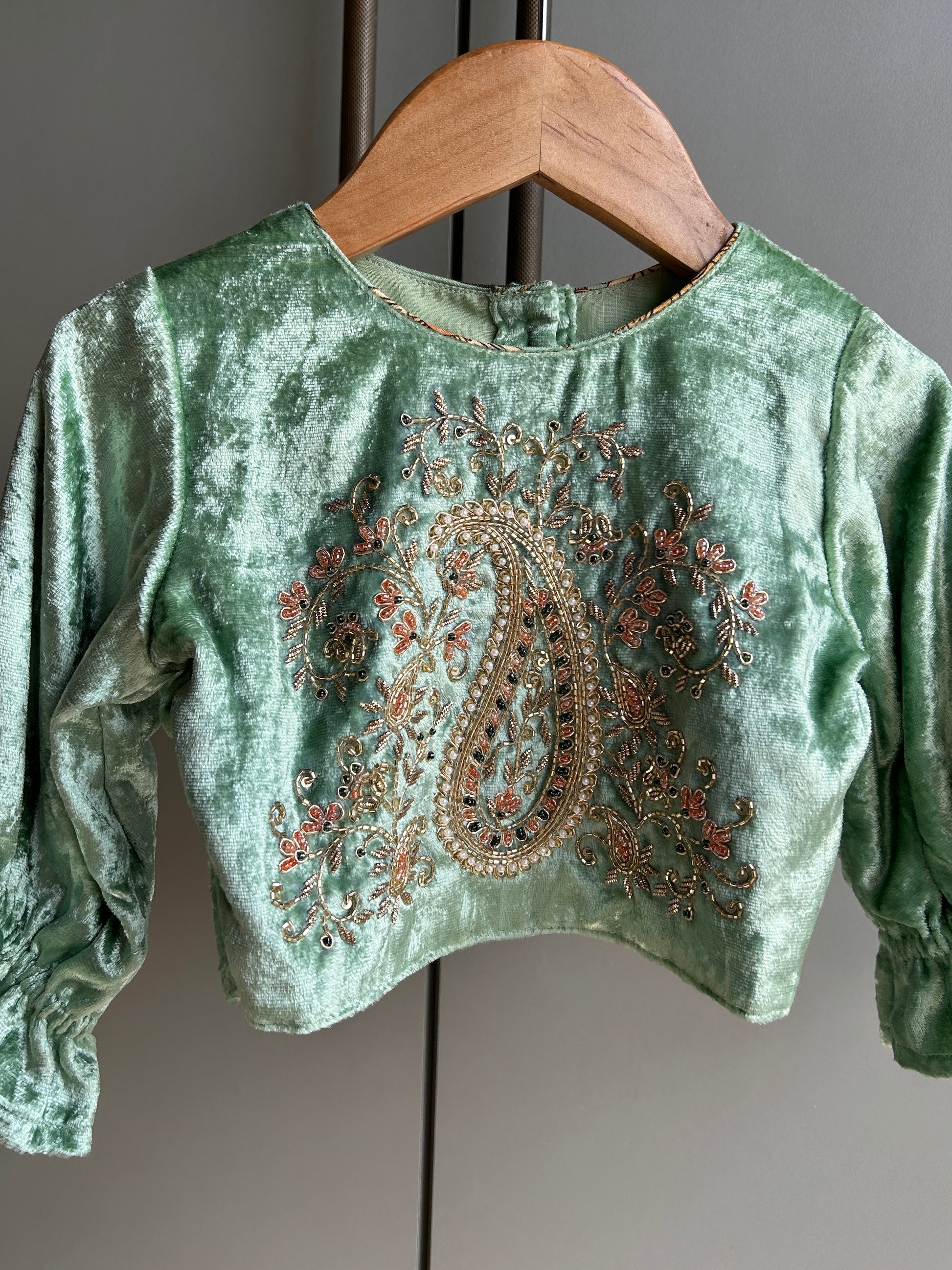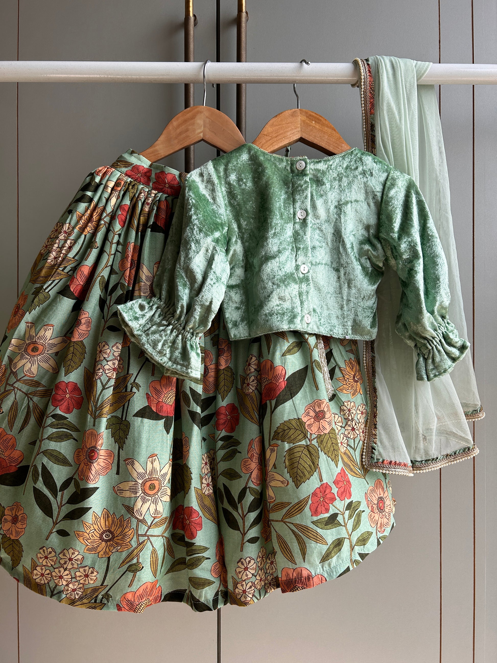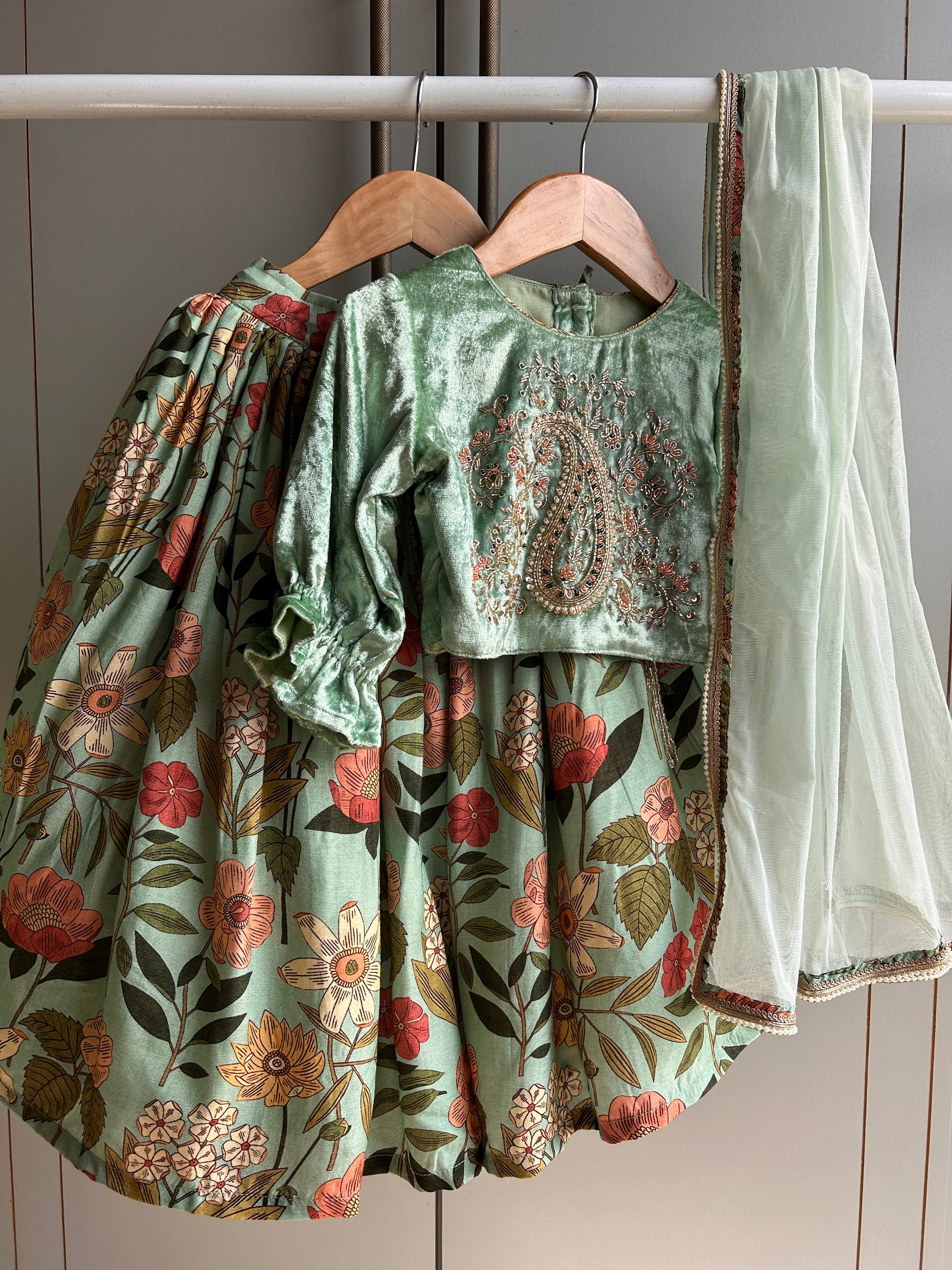 This ensemble features a soft mint green velvet top adorned with intricate hand embroidery in delicate multi-color threads and beads. The blouse showcases a beautifully detailed paisley motif on the front along with gently gathered 3/4th sleeves. It is paired with a vibrant floral printed skirt, designed with a comfortable elasticated waistband. Completing the set is a lightweight mint net dupatta finished with a fine decorative lace border.