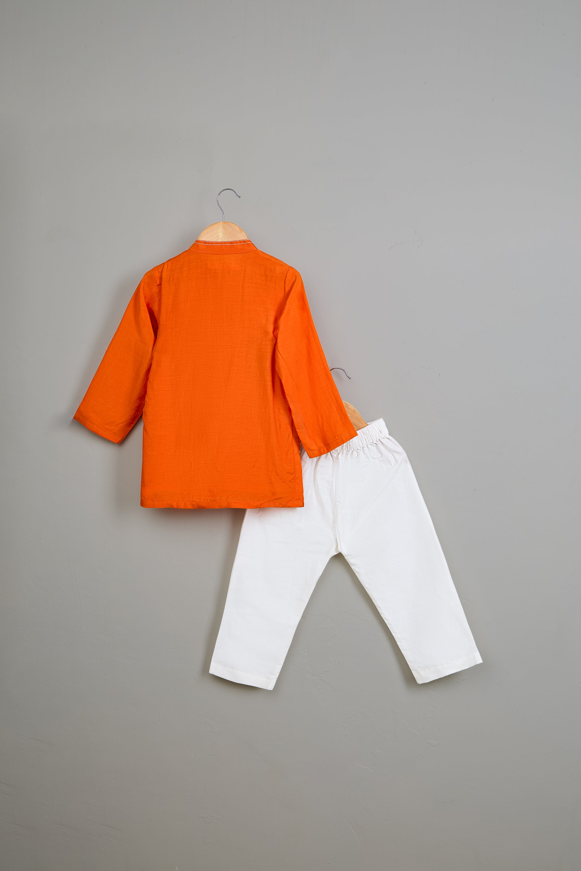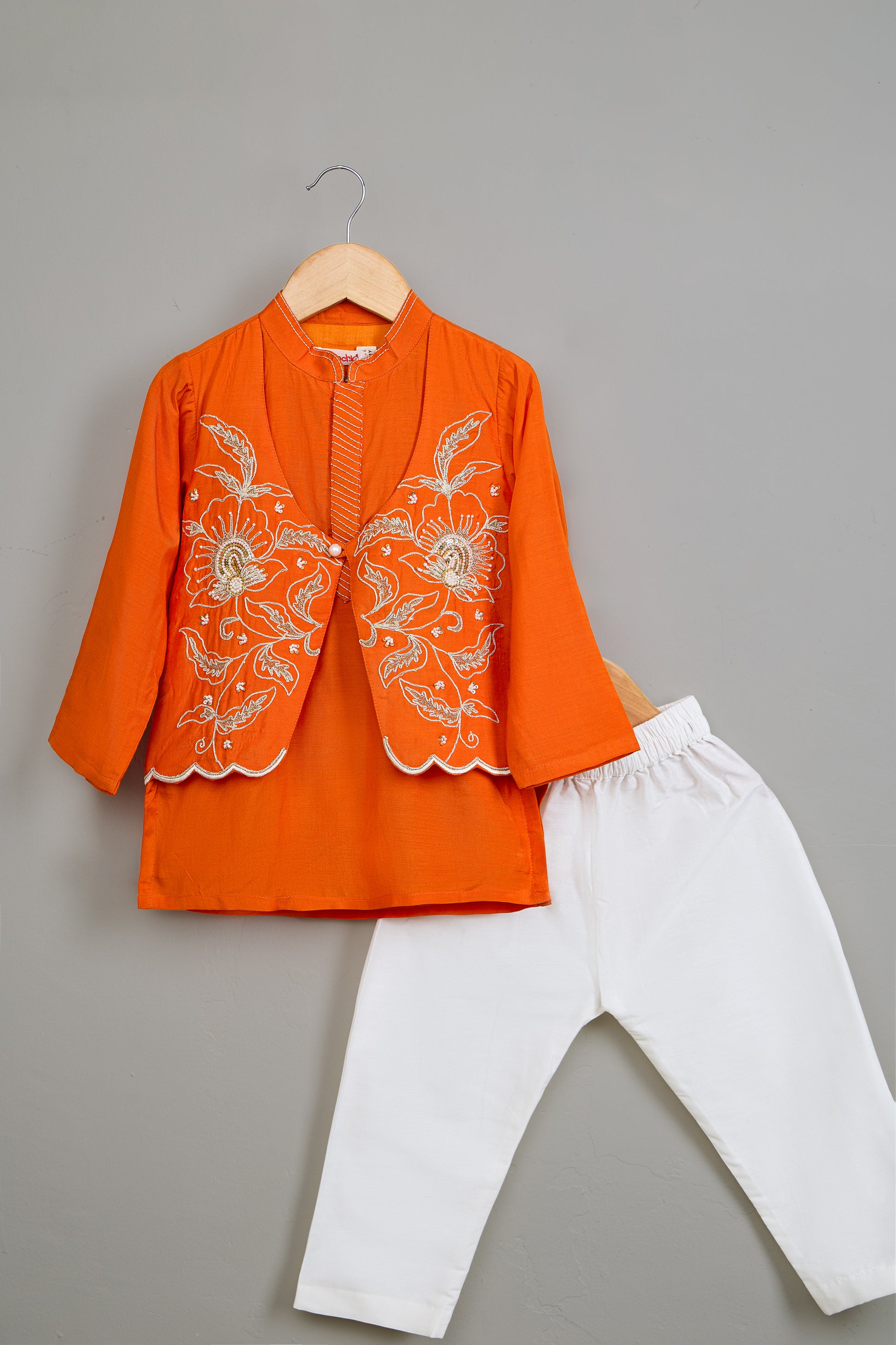 An elegant orange kurta with an attached flap-style jacket, adorned in intricate dori and hand embroidery. Paired with a comfortable pyjama, this set blends traditional craftsmanship with modern design—perfect for festive moments.
