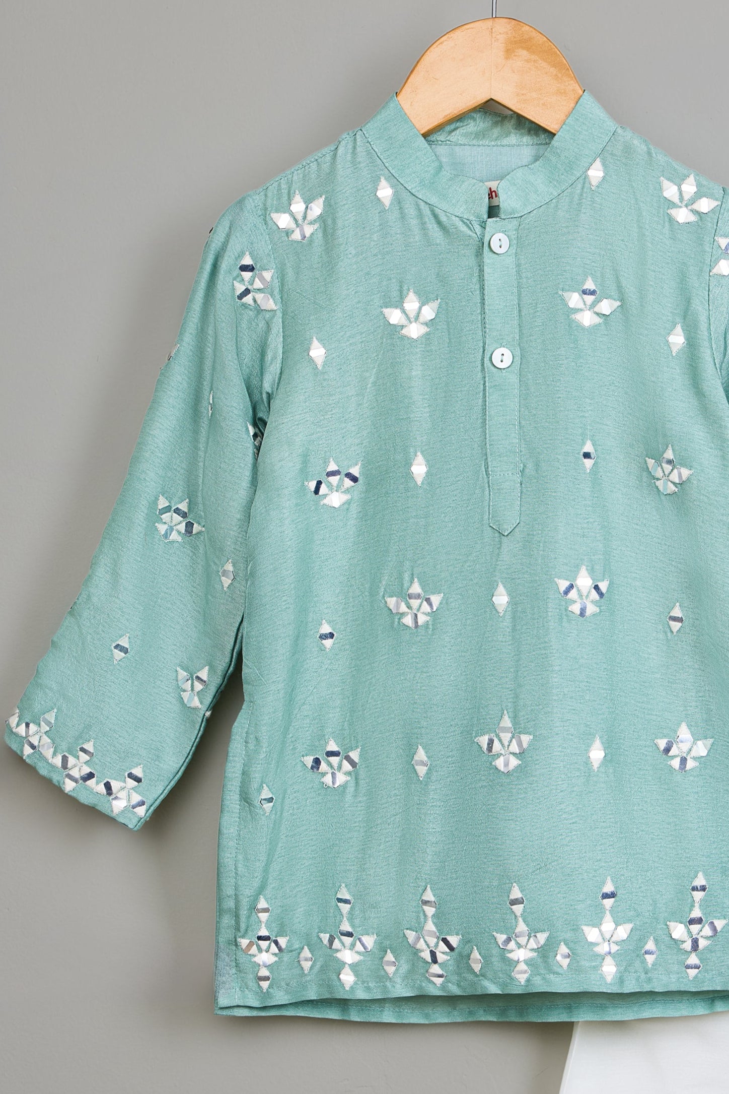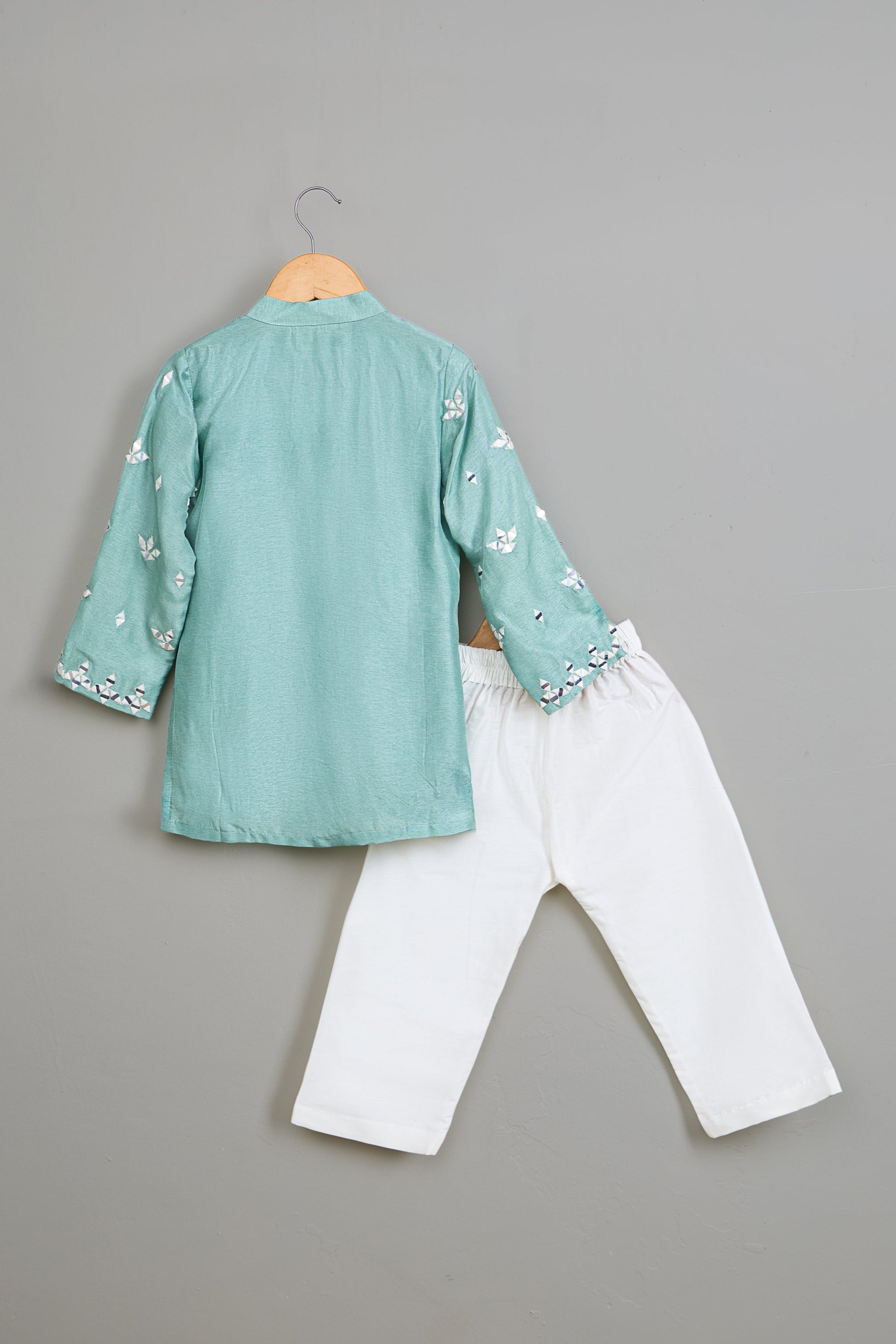Full-sleeved blue kurta with faux mirror and thread embroidery, featuring a mandarin collar, side slits, and front button placket for closure. Paired with an off-white pyjama with an elasticated waist. Note: Embroidery placement may vary from the website image.