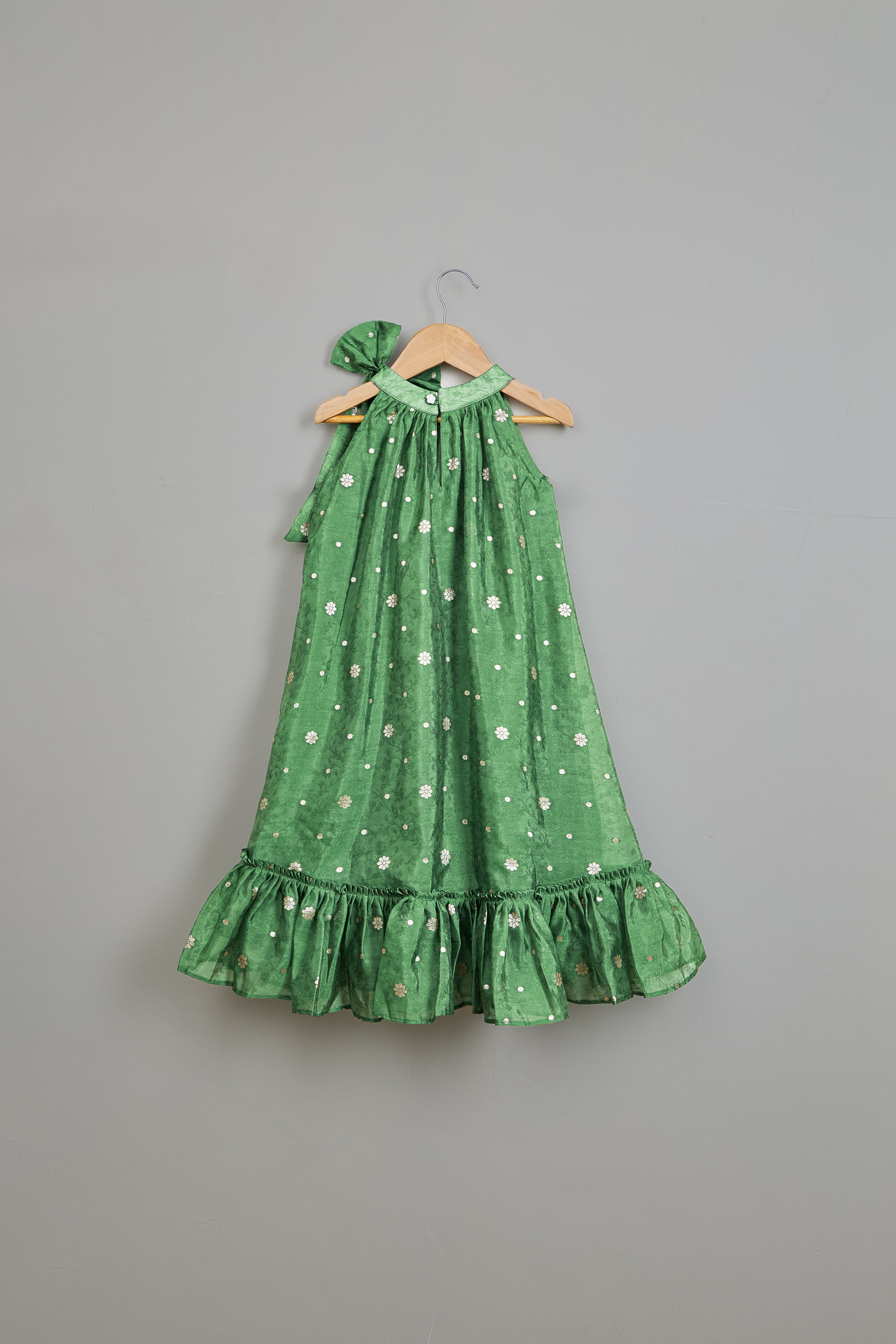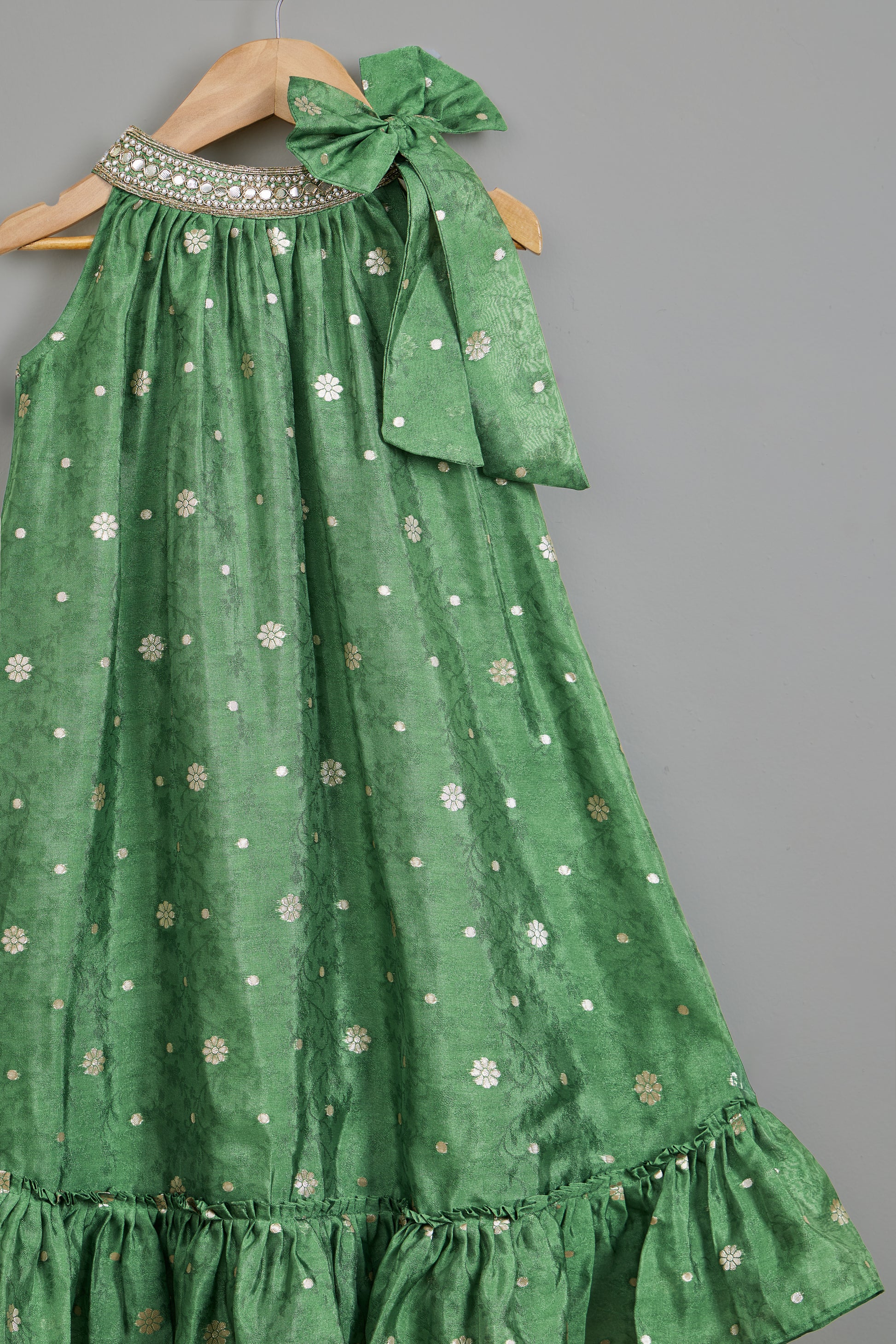 This green halter-neck kurti features pearl, thread, and gota lace embroidery on the neckline, a chic side bow, flower loop button at the back, and a flared, ruffled hem. Crafted with soft cotton lining, it is ankle-length, perfect for festive occasions.