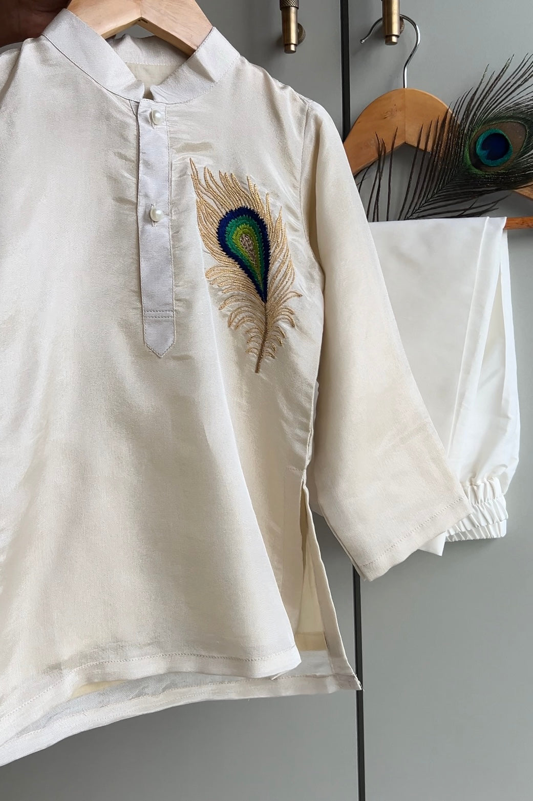 Shimmery kurta with Mor Pankh embroidery on the front, featuring a mandarin collar, pearl button placket, and side slits. Paired with a comfortable pyjama with an elasticated waist.