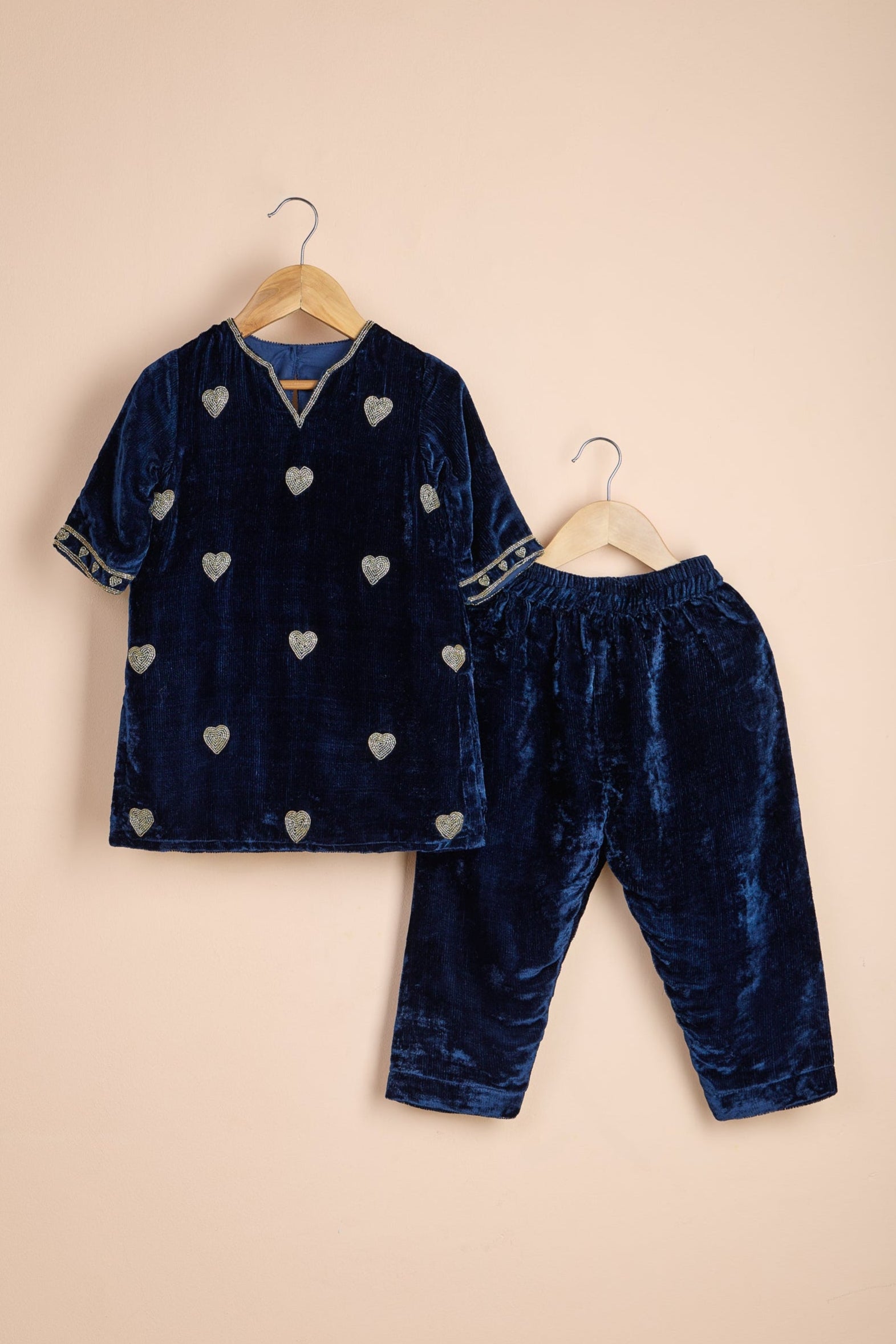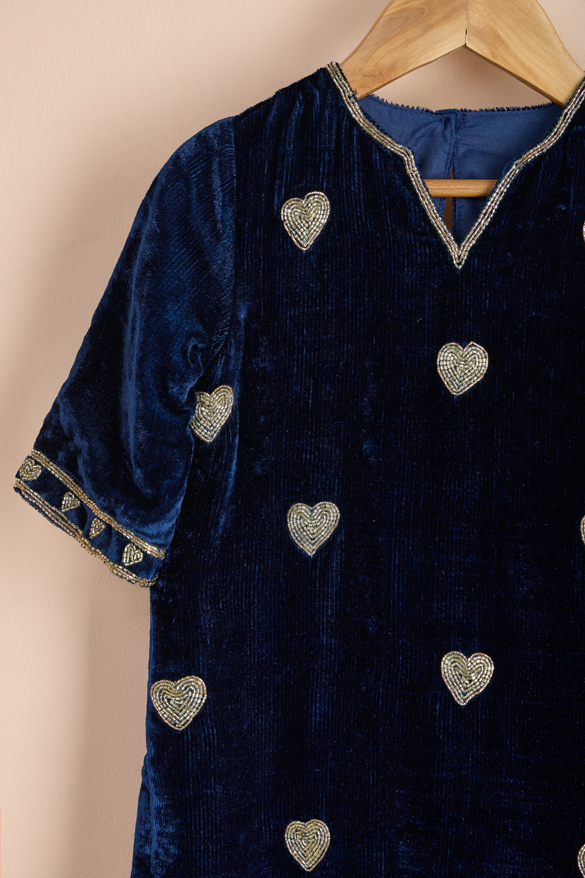 This elegant ensemble features a stylish V-cut neck kurti adorned with sequin and cut dana heart-shaped embroidery, detailed sleeve openings, and a loop button closure at the back. Paired with elasticated waistband pants, it blends intricate handwork with modern comfort.