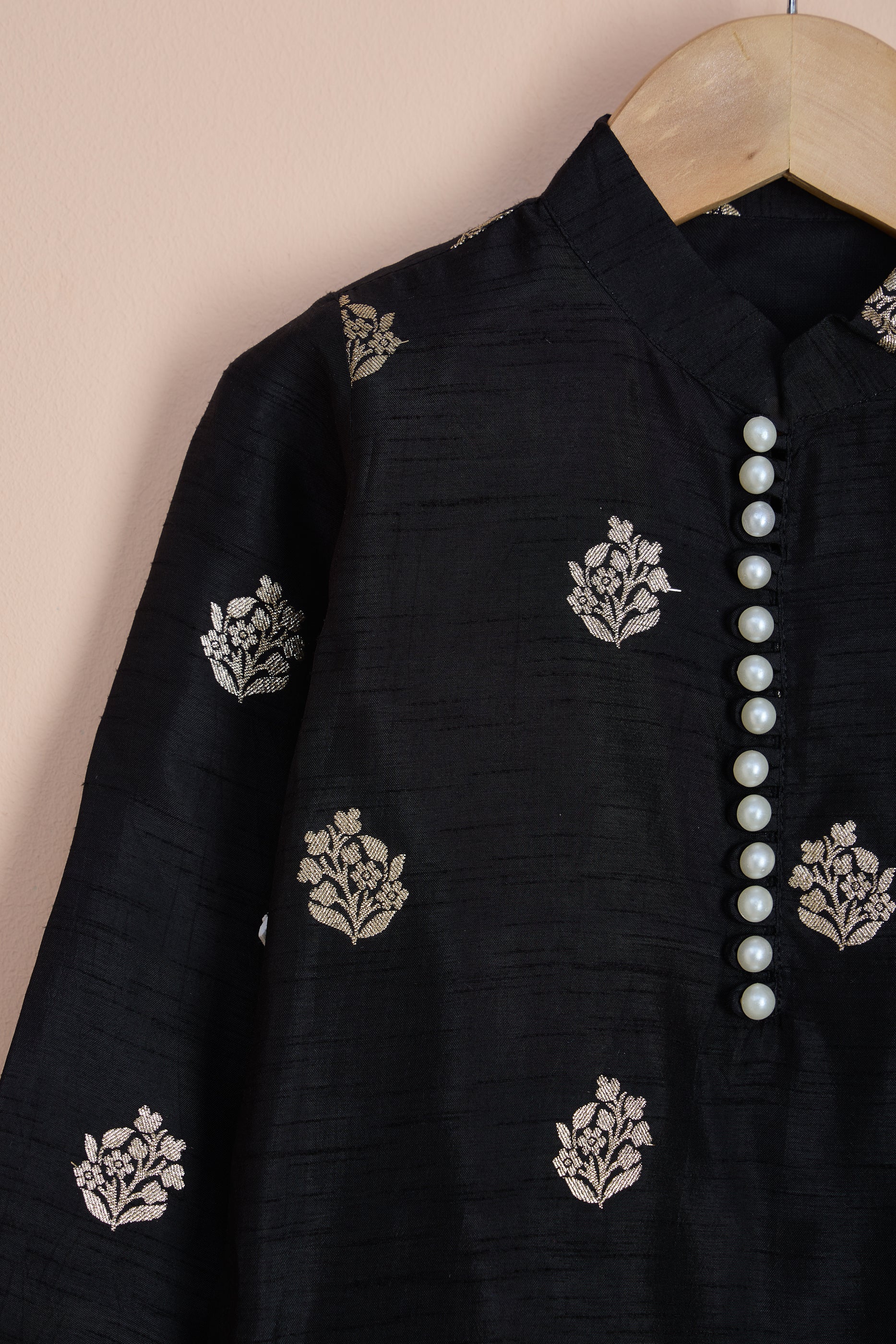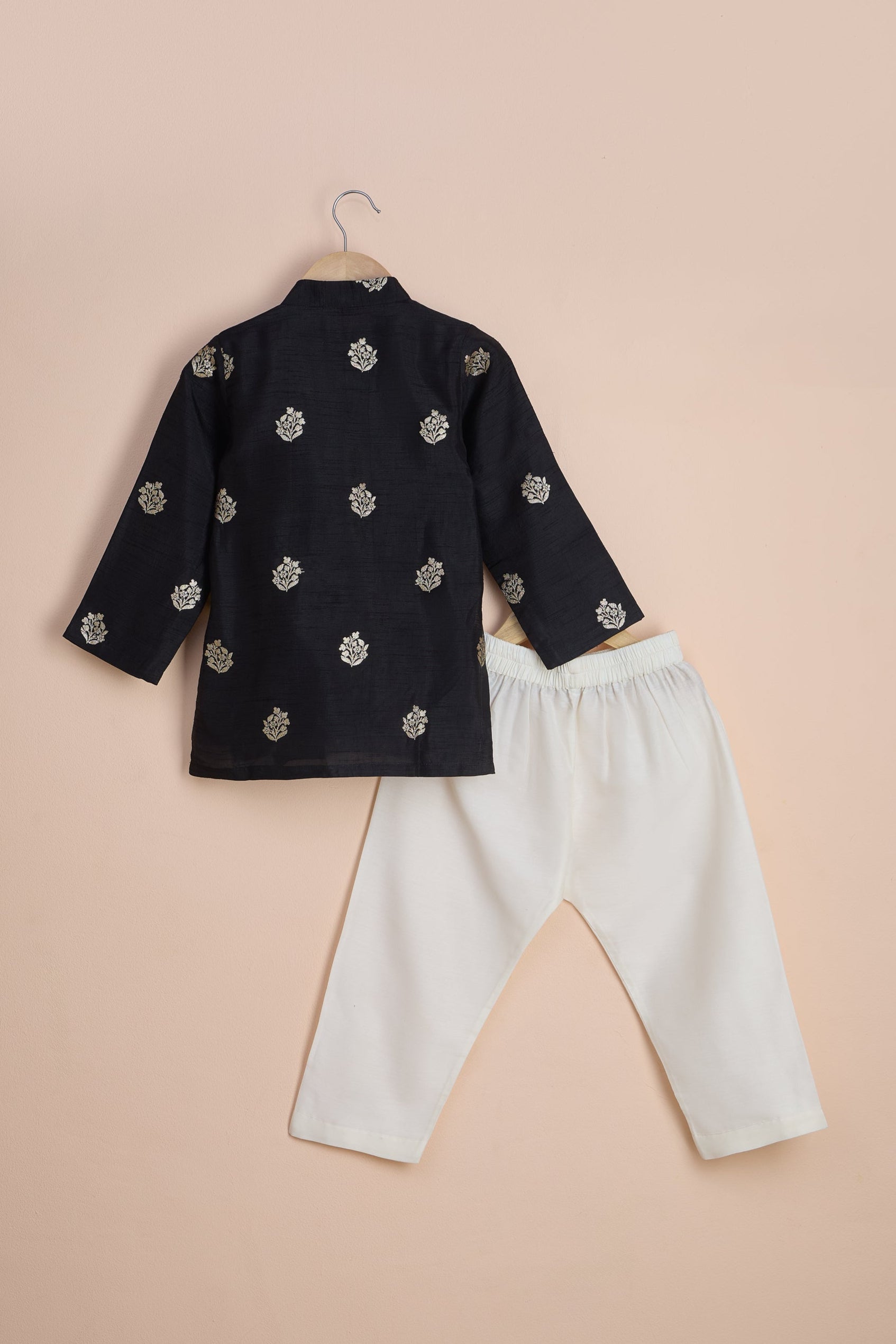 Black viscose jacquard brocade kurta with a pearl button panel, mandarin collar, and side slits, paired with off-white elasticated waist pyjamas for boys.