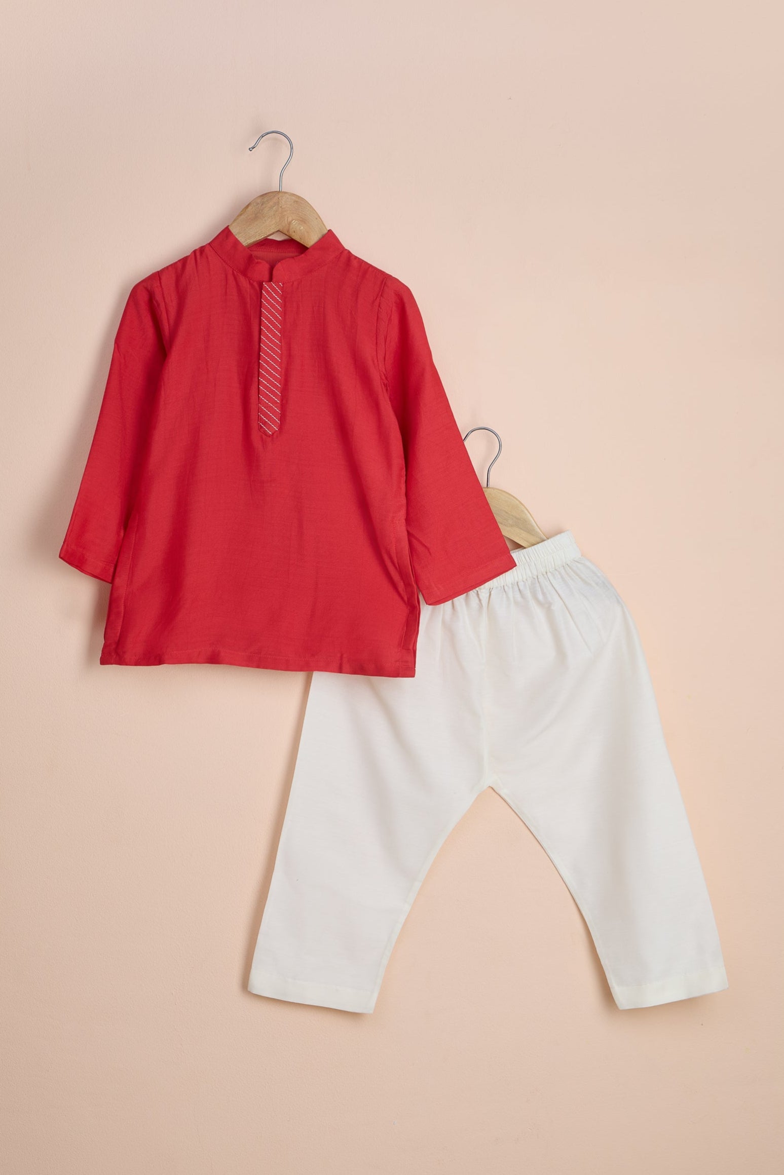 Mandarin collar kurta with front opening, side slits, and a sleeveless V-neck jacket featuring embroidery, embellishments, and a stylish cut-out hem. Paired with elasticated waist pajamas for a complete look.