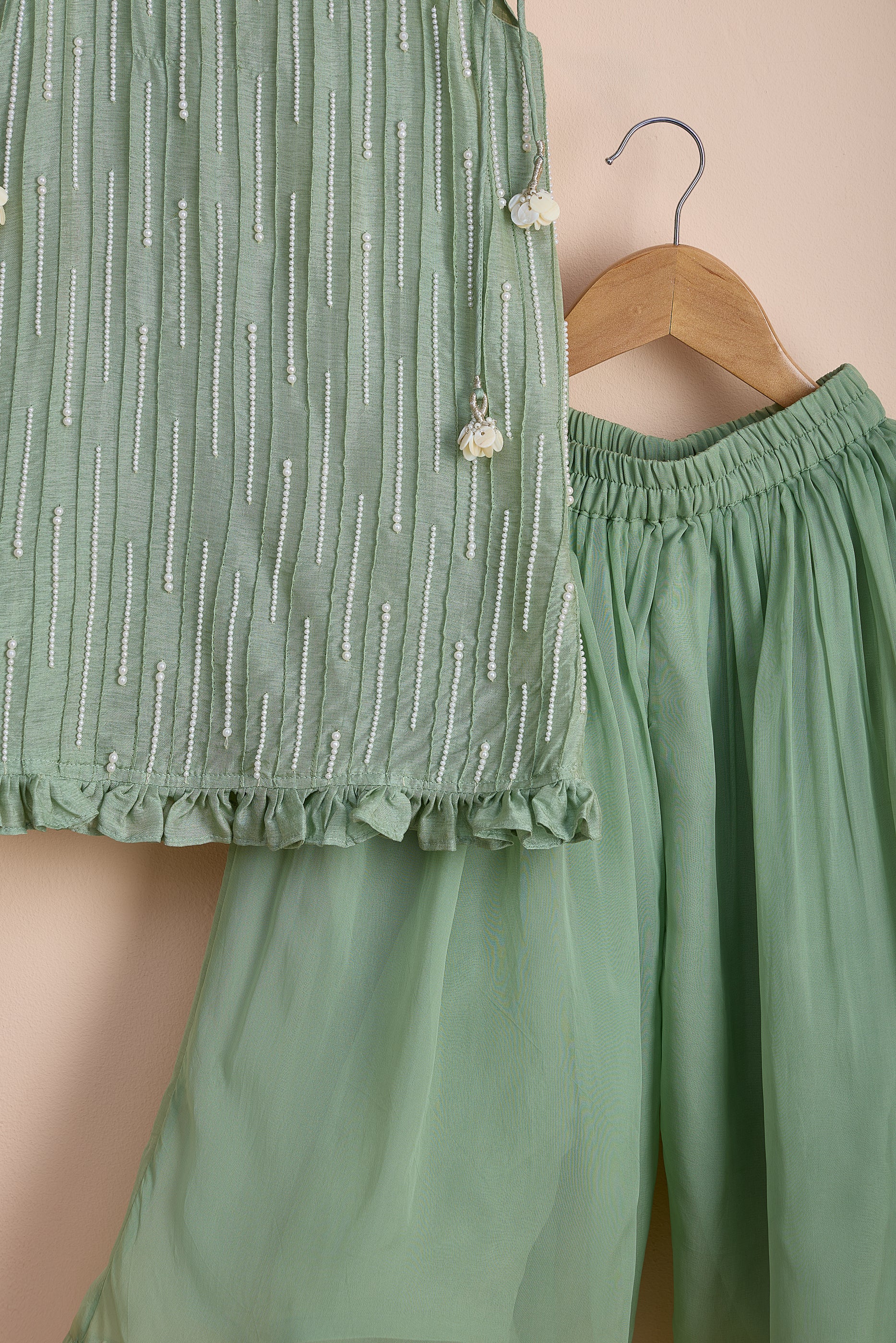 Turquoise green tie-up top with pearl hand embroidery, pin tucks, and a frilly hem. The top has a key-hole loop opening at the back. Palazzo is crafted in organza fabric and is completely elasticated at the waist.
