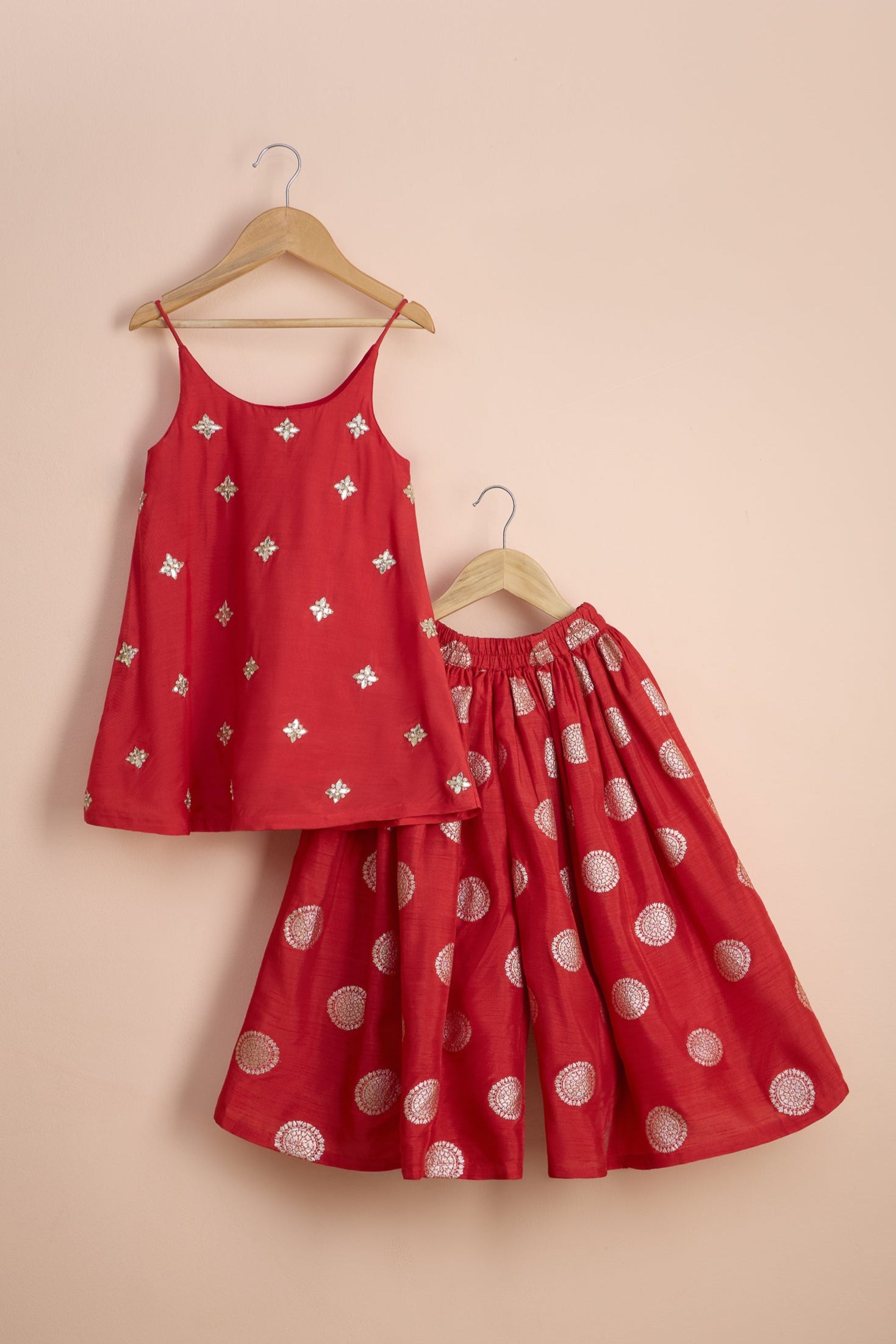 Red strappy kurti with all over gota hand embroidery. Top has a keyhole loop opening at the back. Palazzo is crafted in a premium jacquard buta fabric and is completely elasticated at the waist.