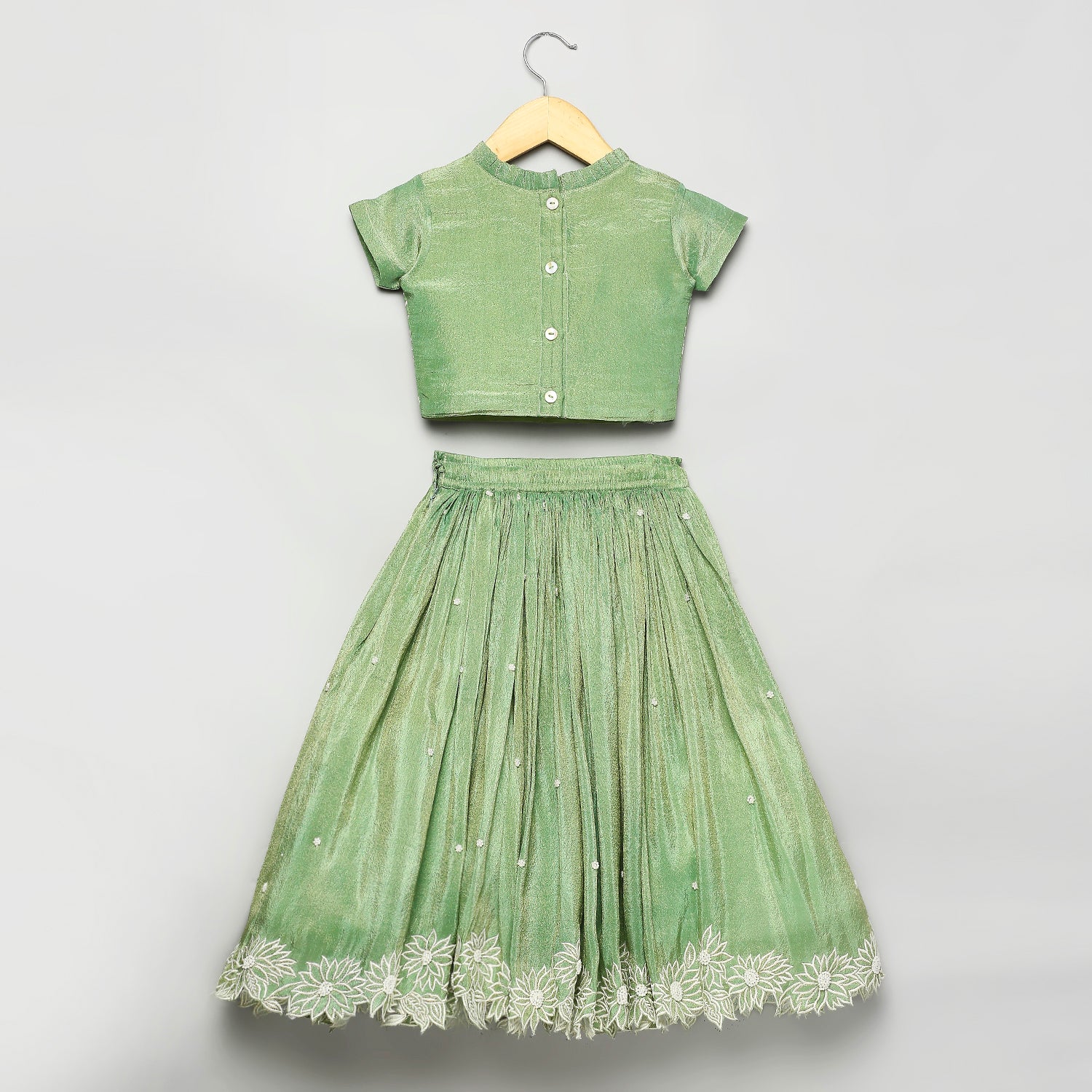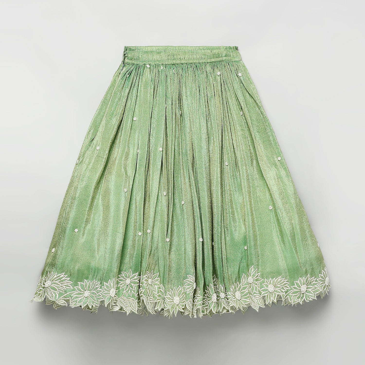 - The hem and yoke of the lehenga is decorated with manually done floral embroidery.