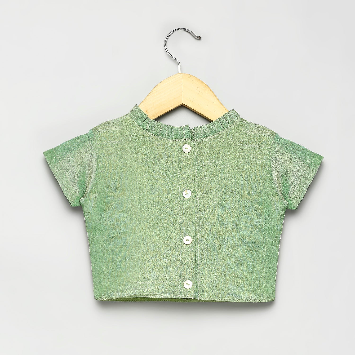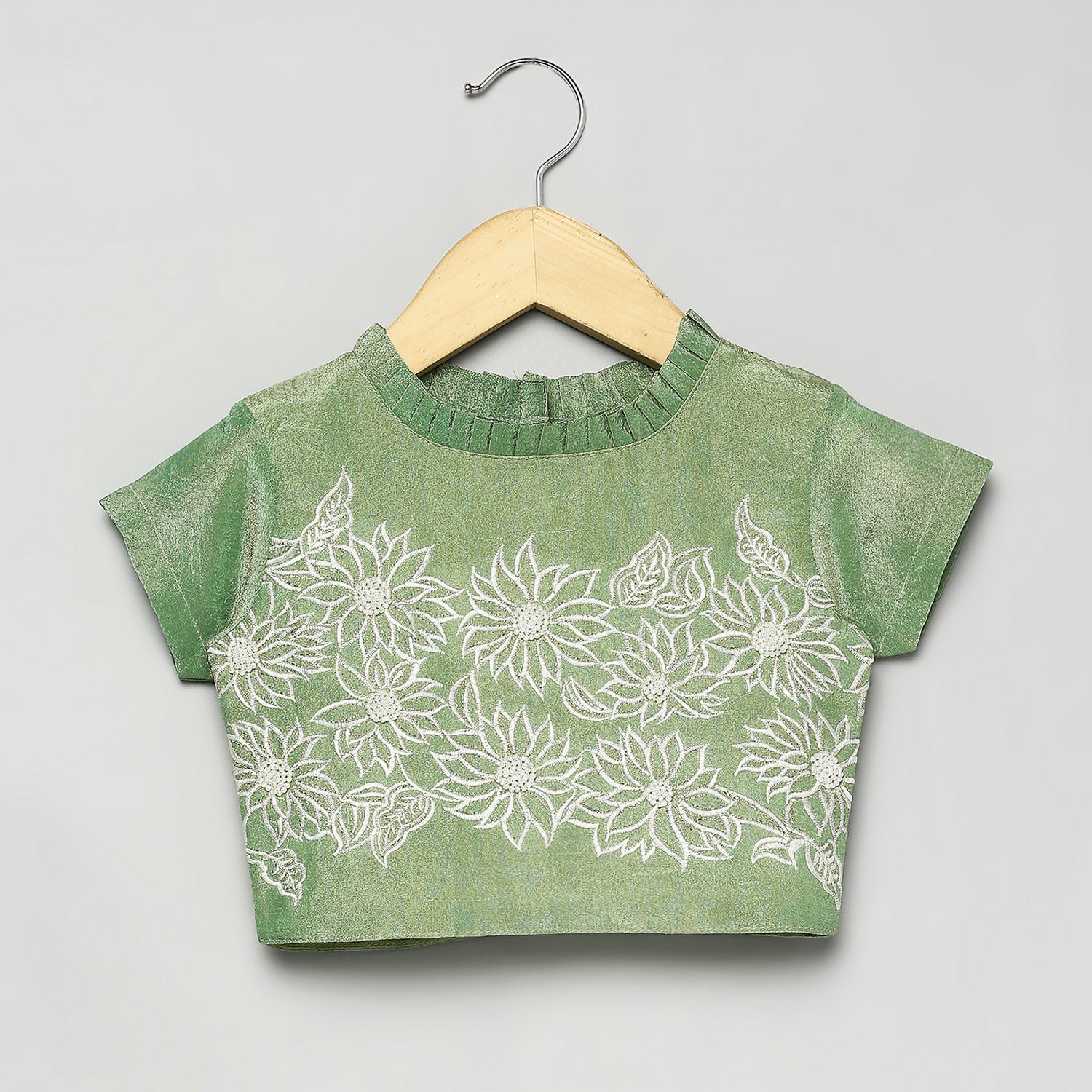 - Green top featuring floral embroidery at the front and a pleated neckline, with a back button closure.