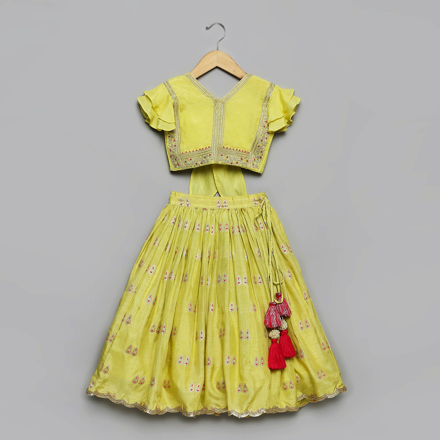 The embroidered lehenga features an elasticated back waist and an adjustable front drawstring with fringe tassels.