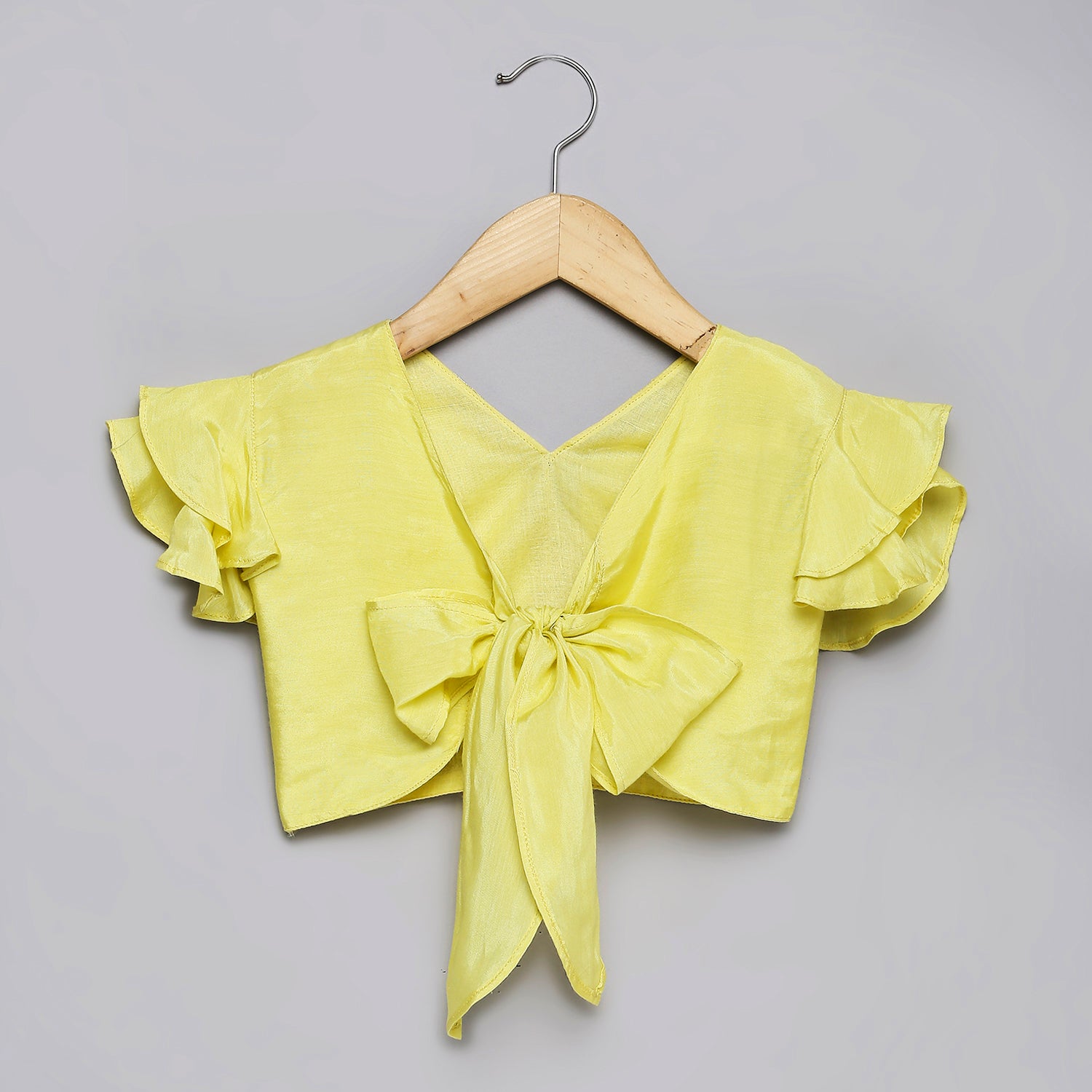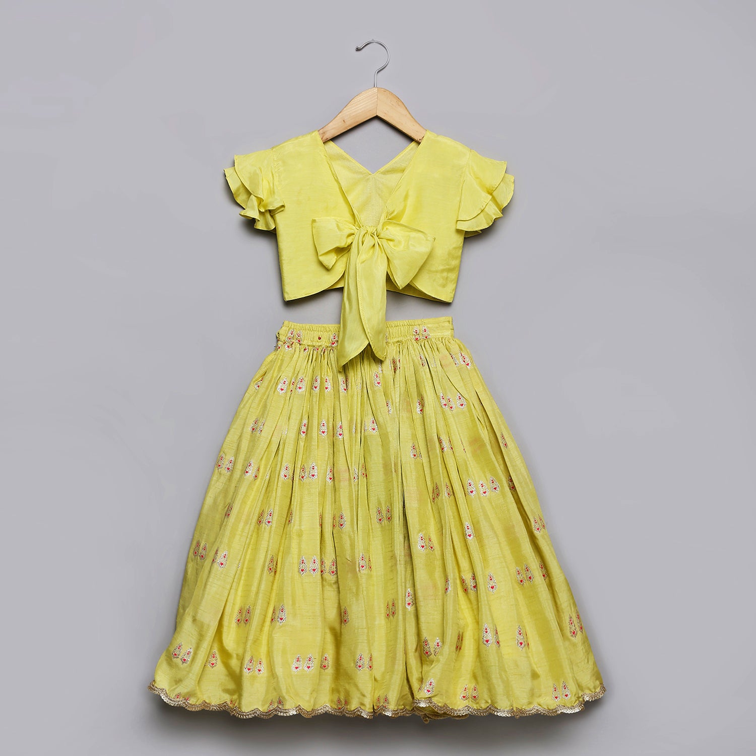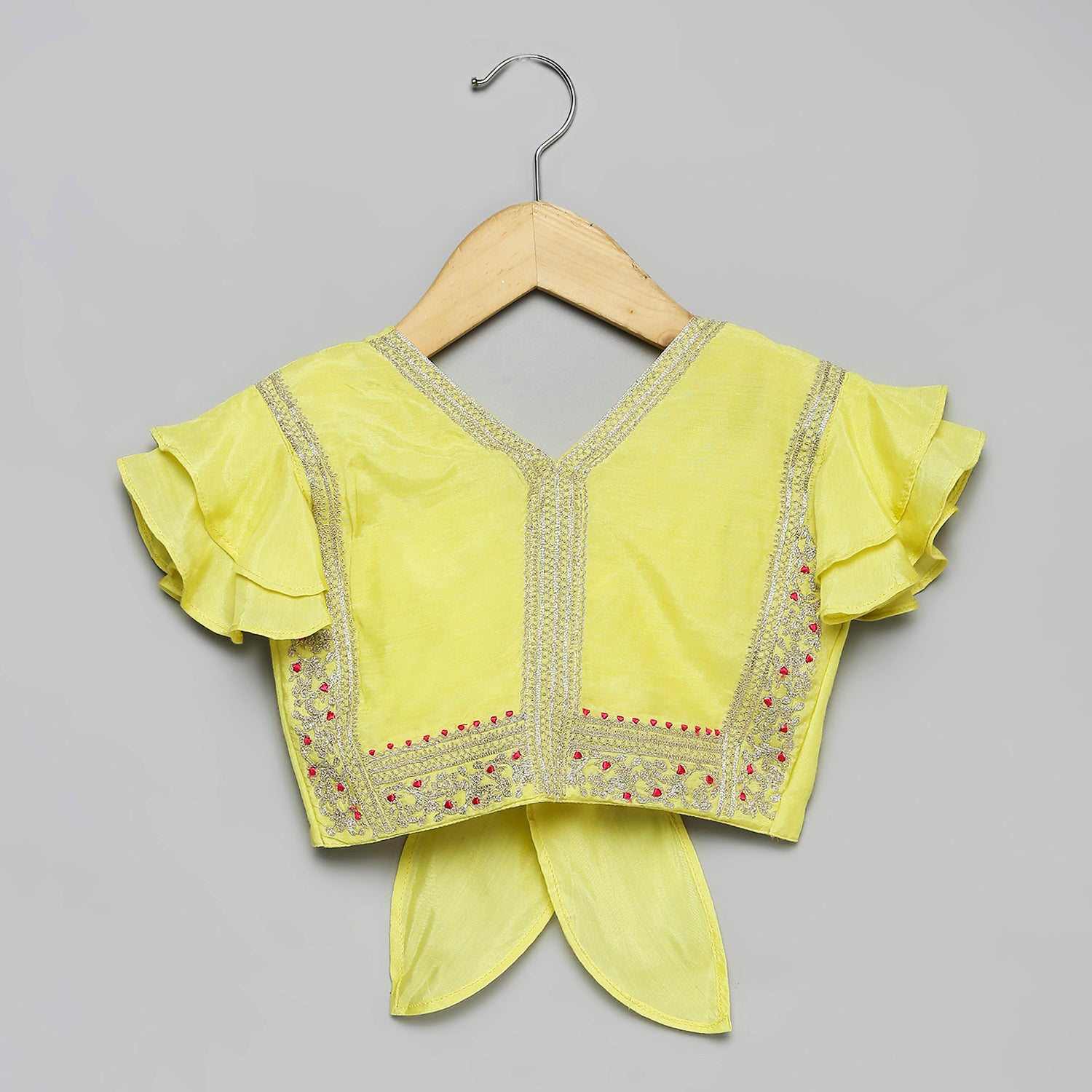 The top has a V-neck and a back tie closure, the lehenga is lined with can-can and cotton lining.
