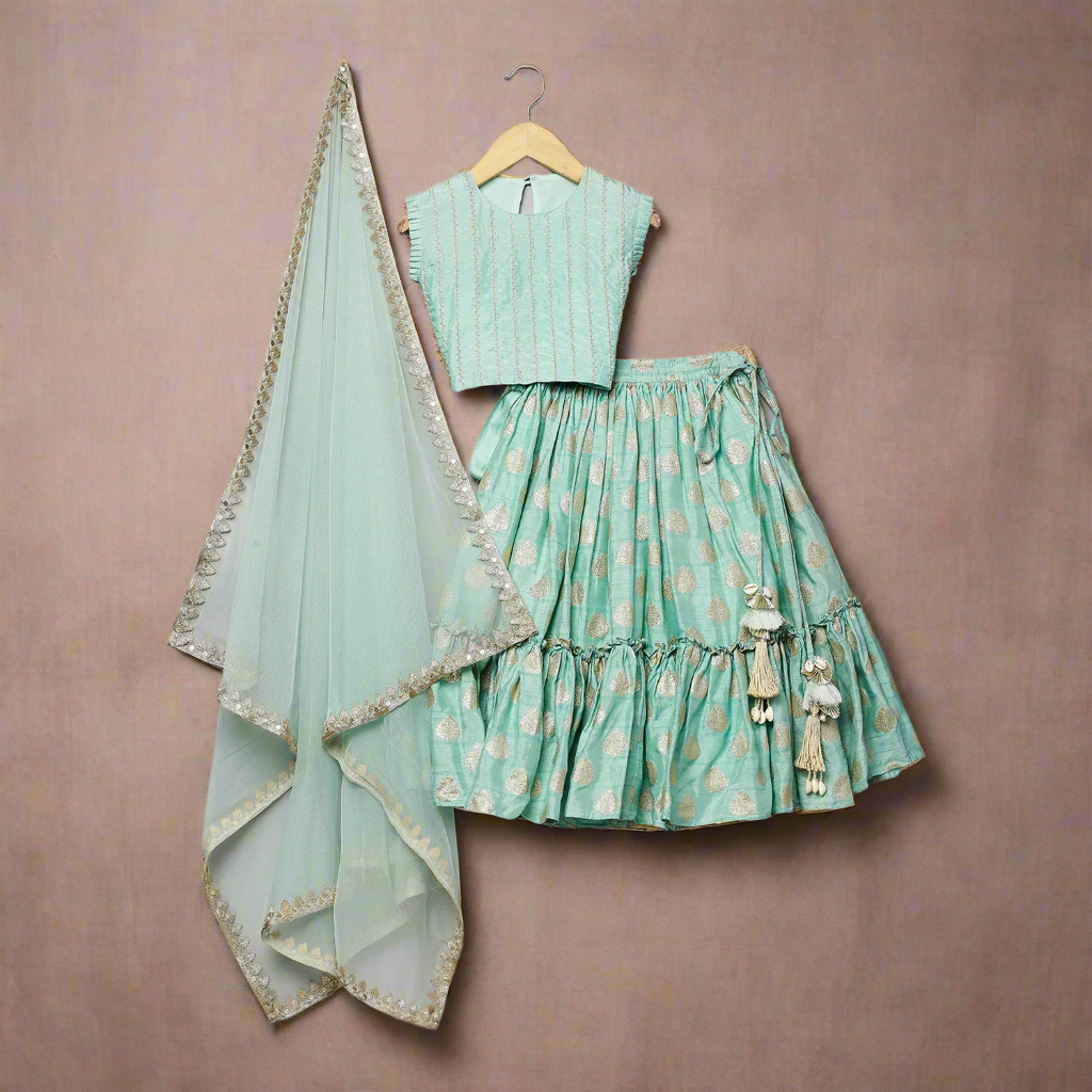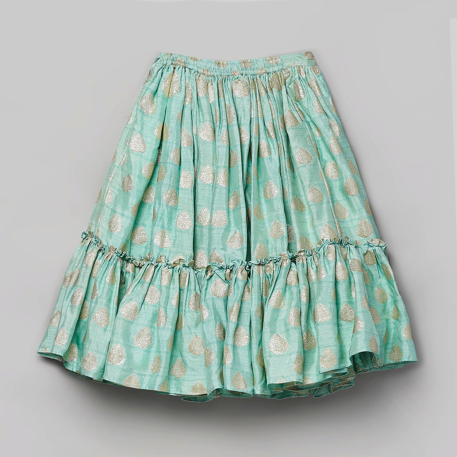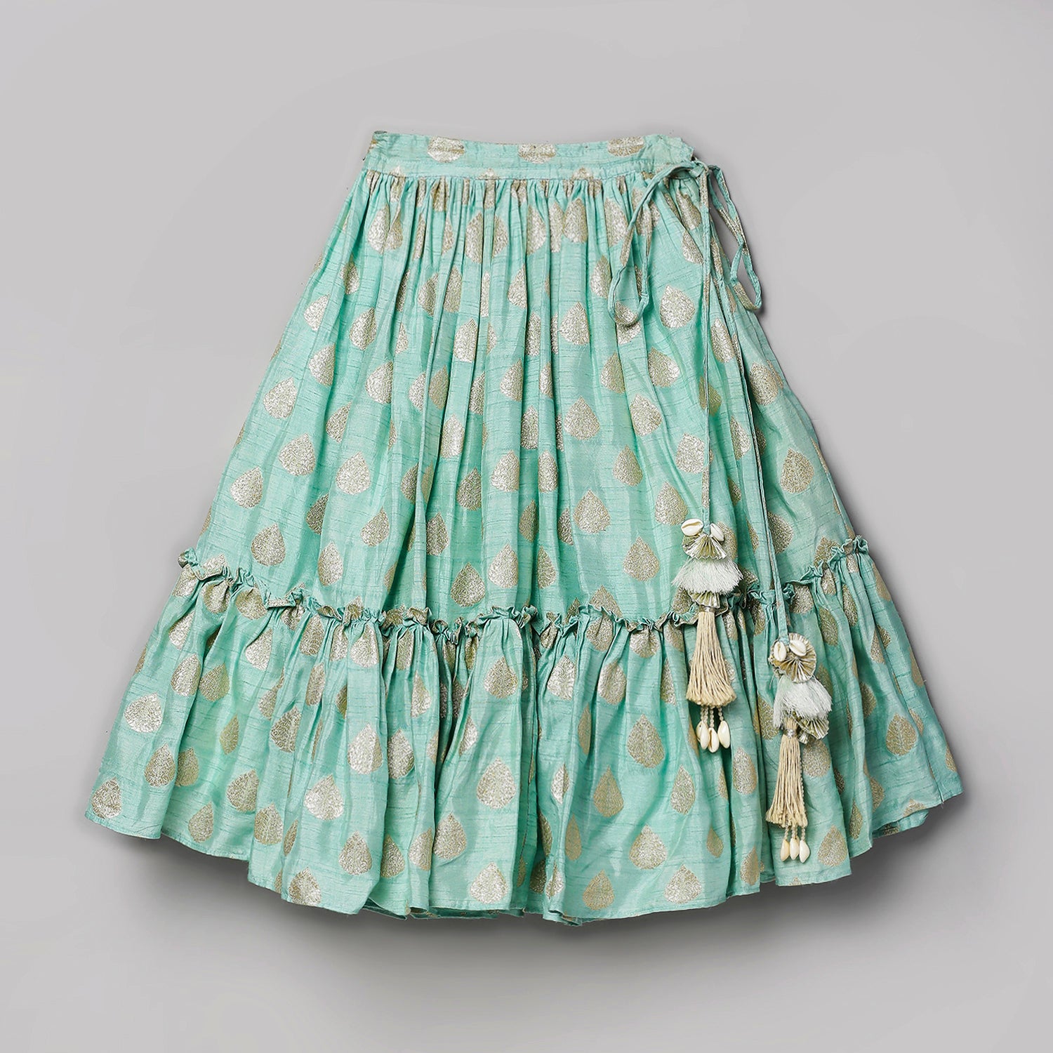 -  Lehenga with elastic at back of waist and adjustable drawstring to tie the knot at side with cowrie and thread tassels attached to it