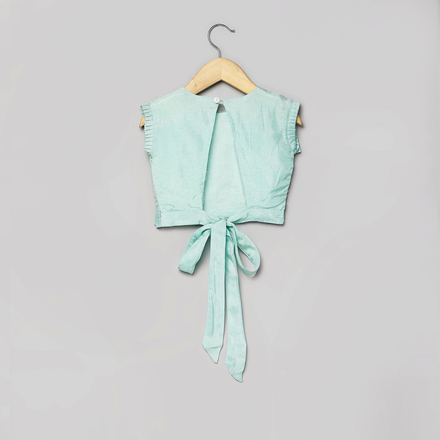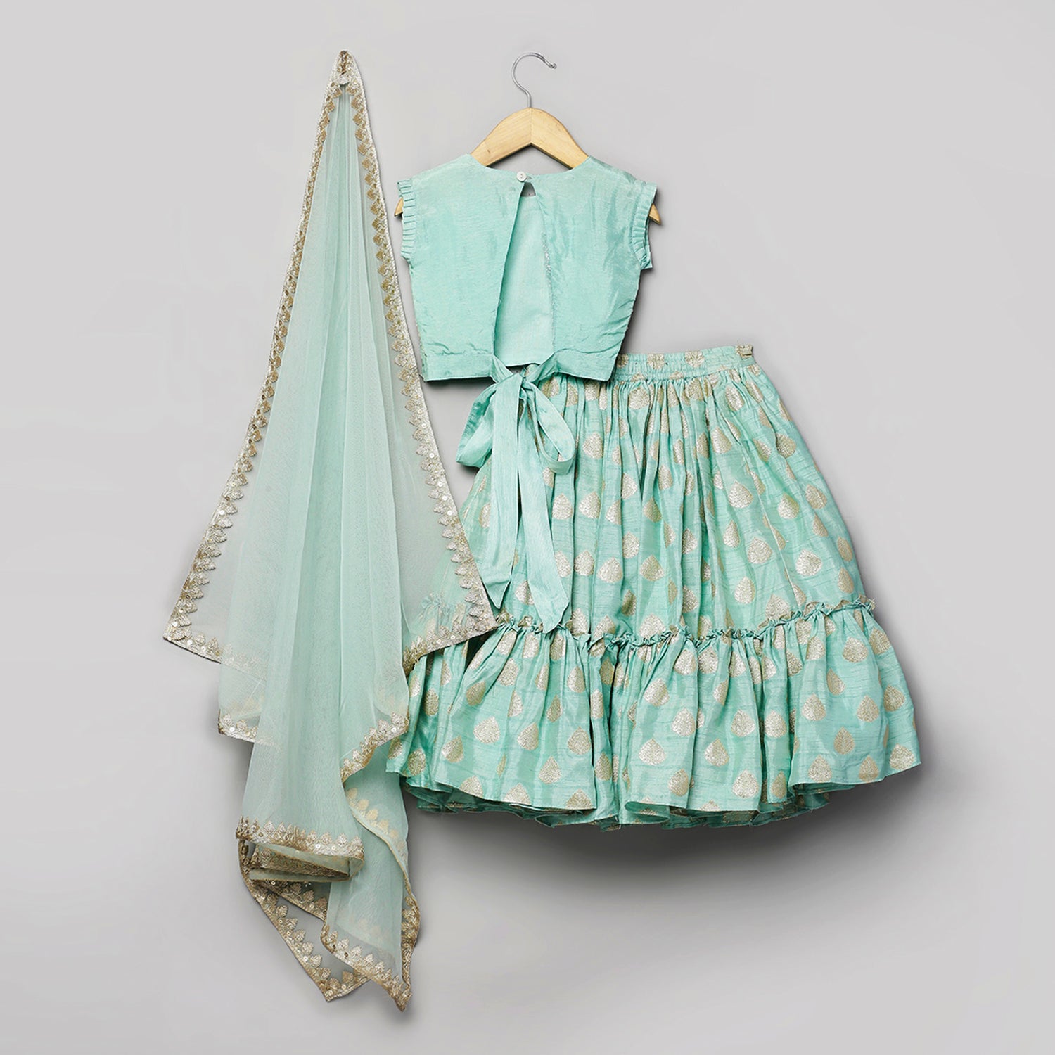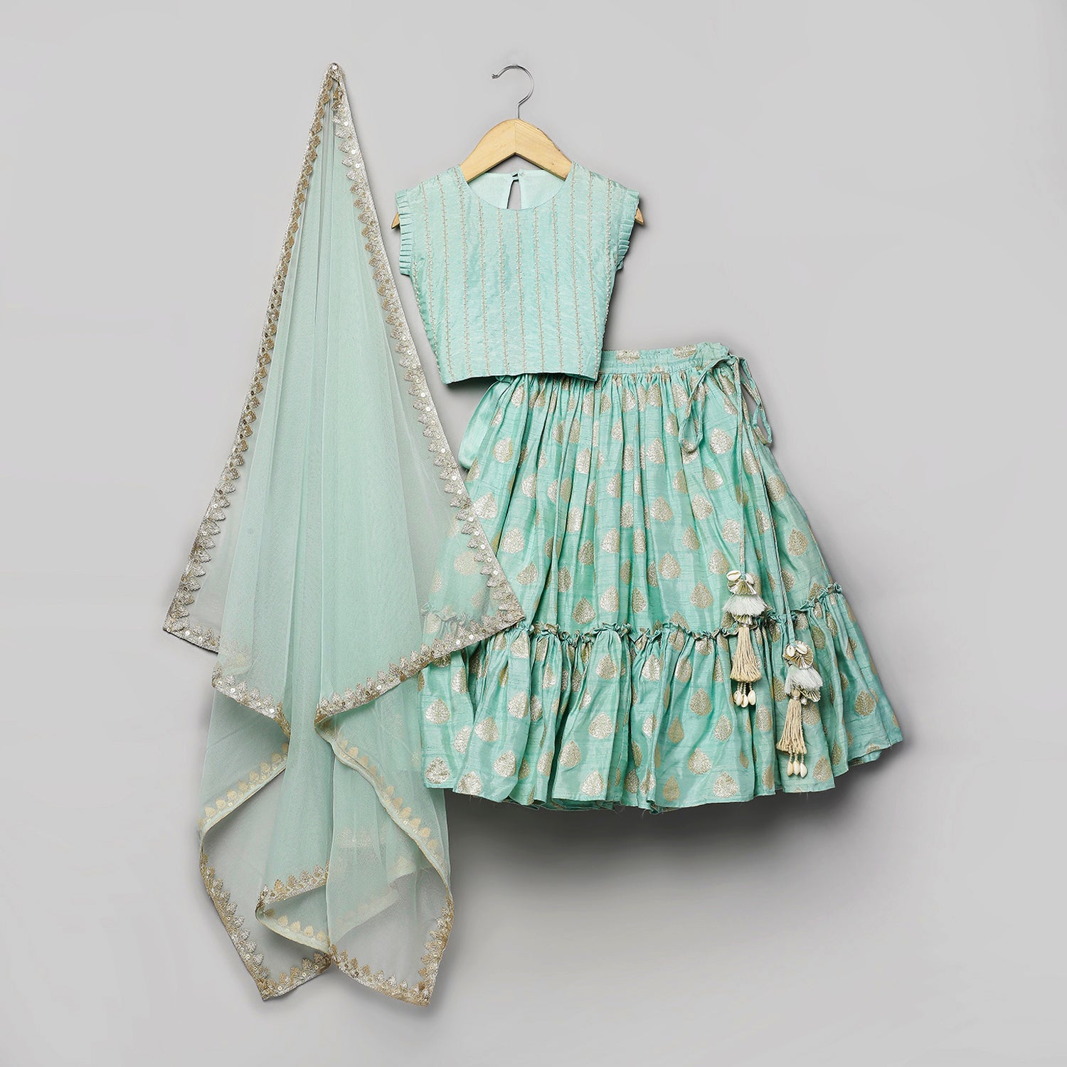 -  Lehenga with elastic at back of waist and adjustable drawstring to tie the knot at side with cowrie and thread tassels attached to it