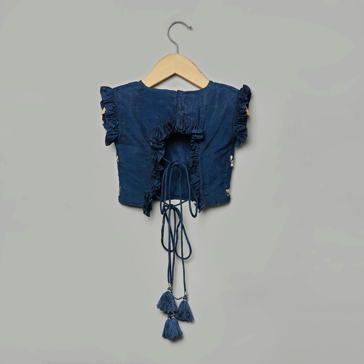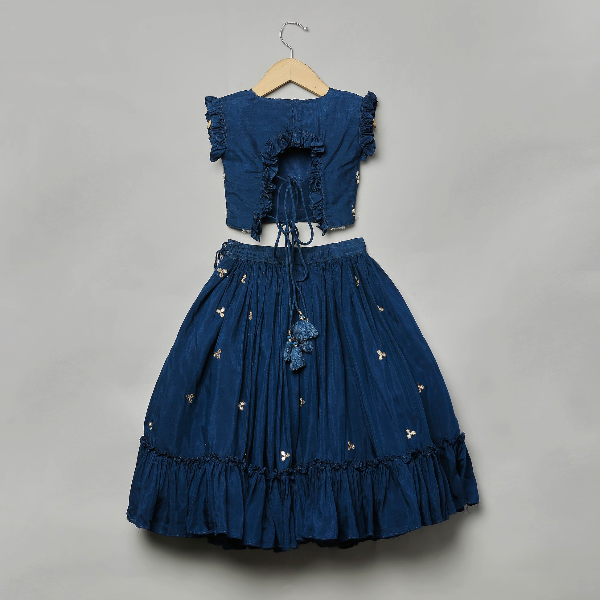 Hand embroidered lehenga and pleated blouse set with shell enhanced tassels
