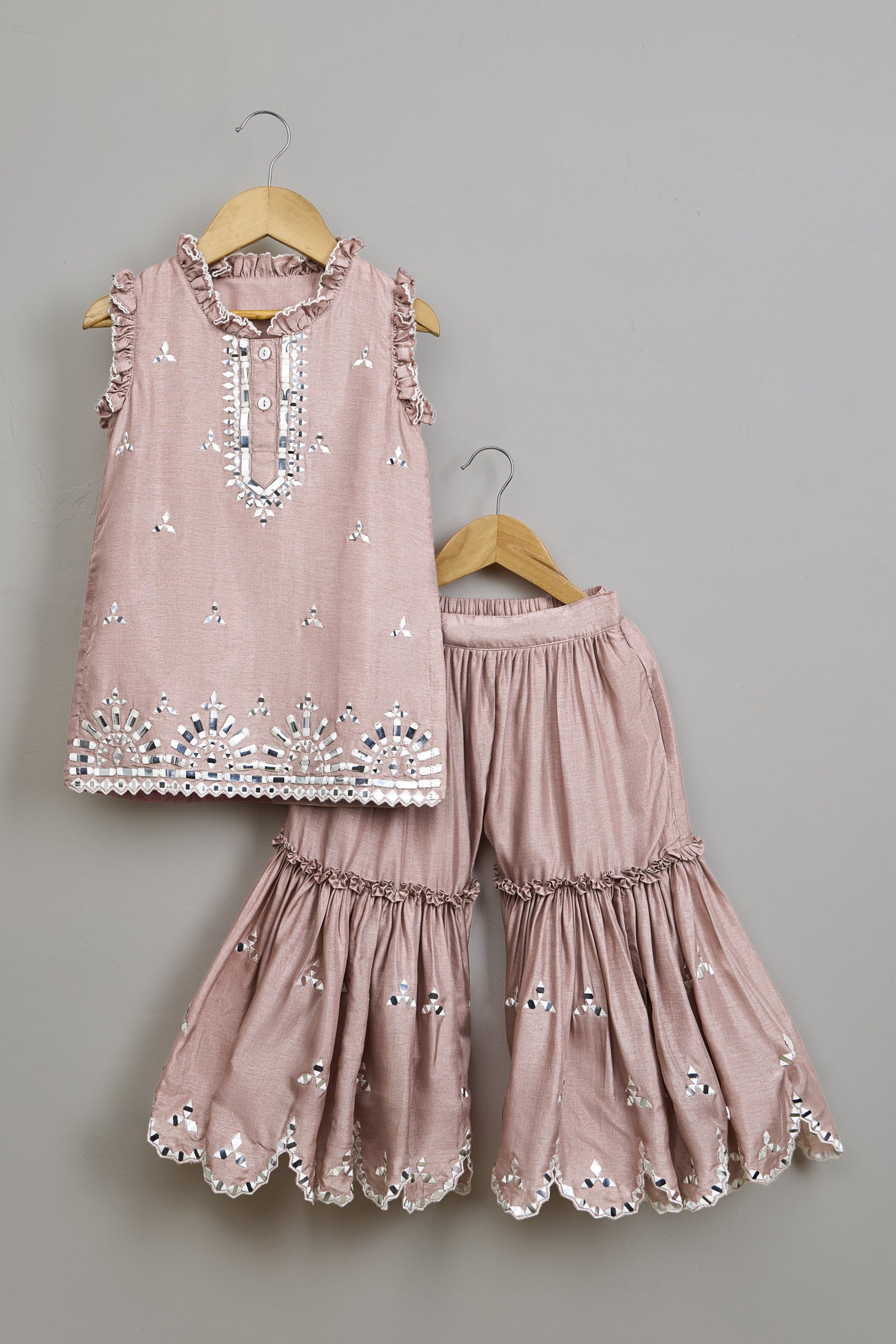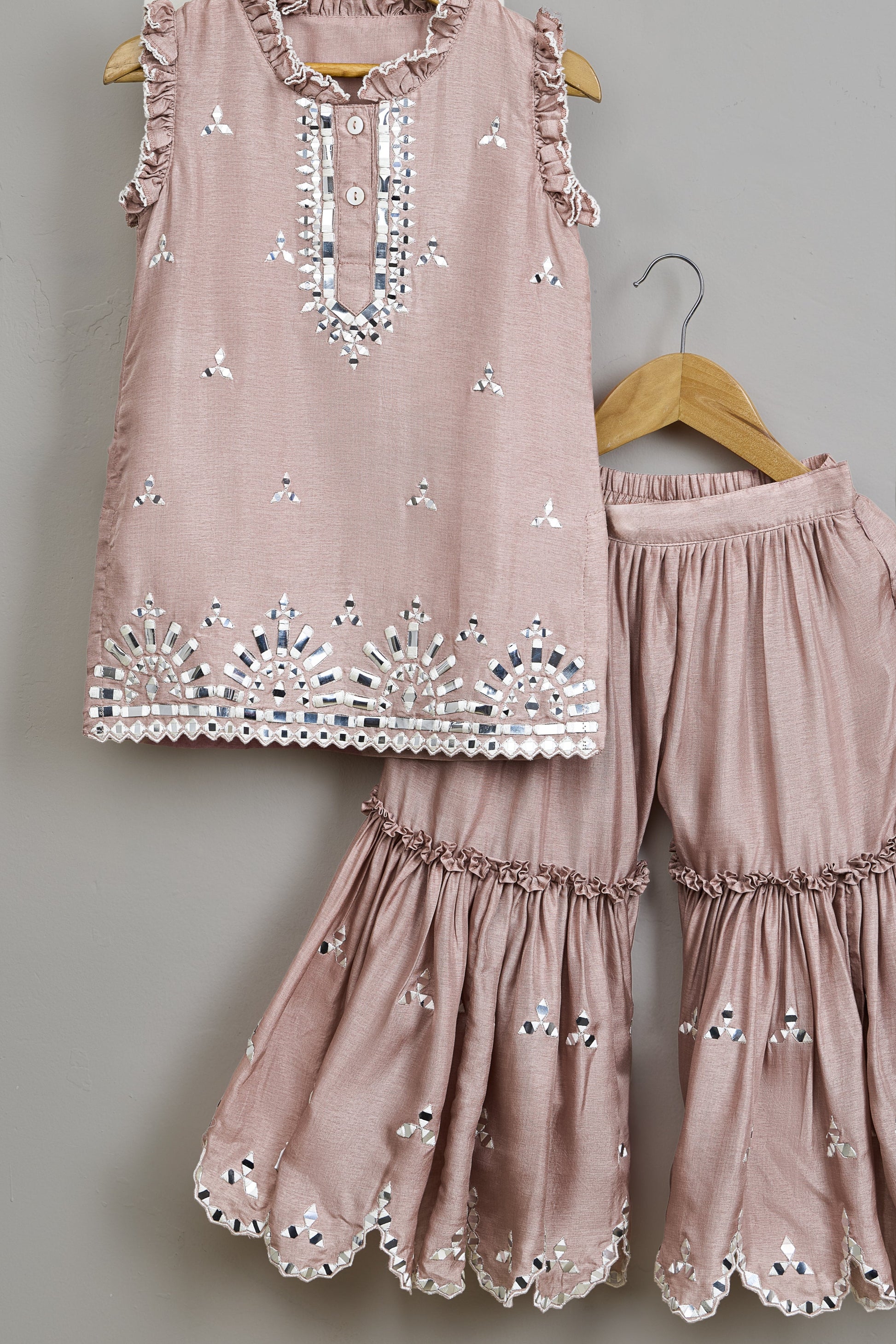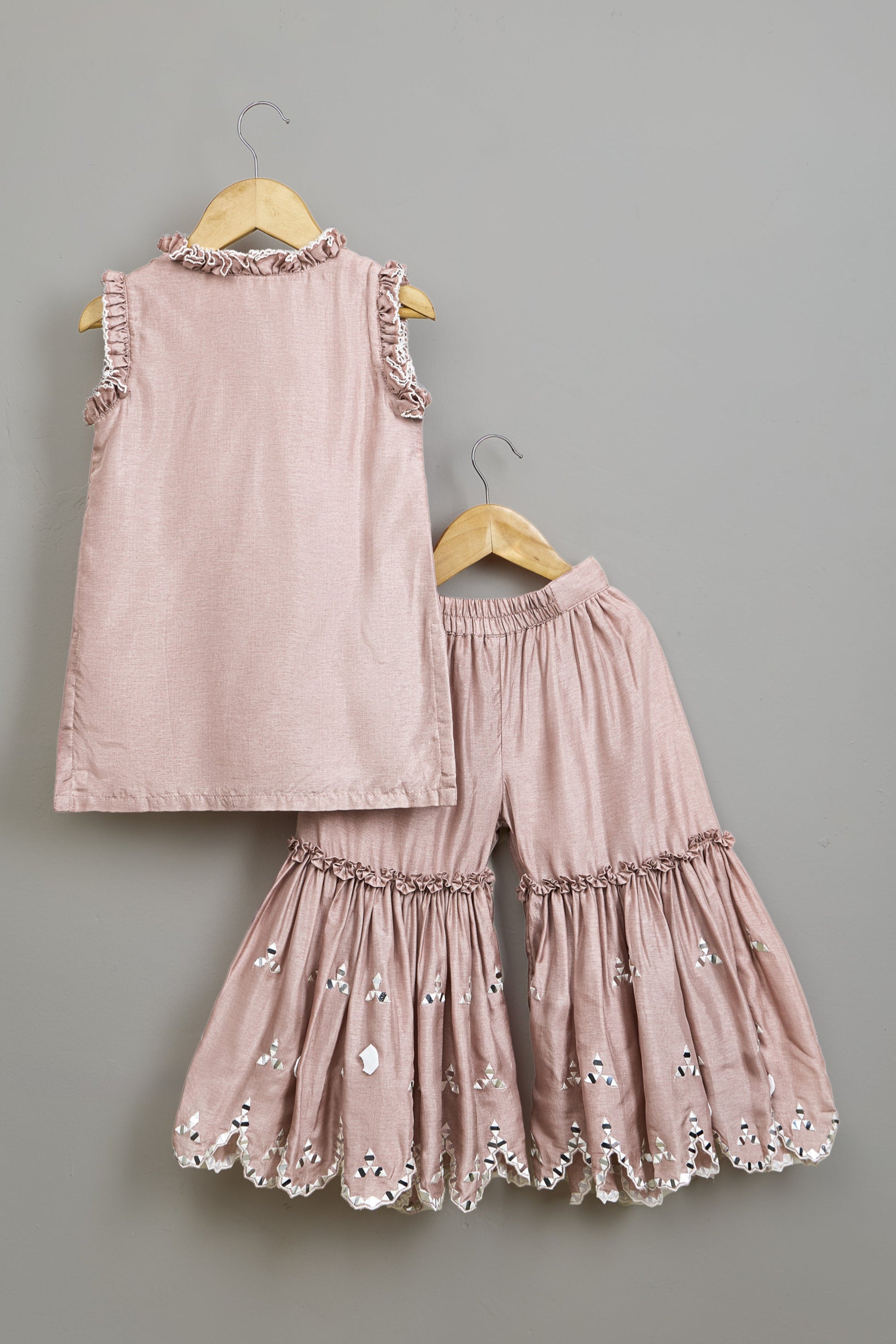 Pink Faux Mirror Embroidered Ruffle Detailed Kurti With Sharara