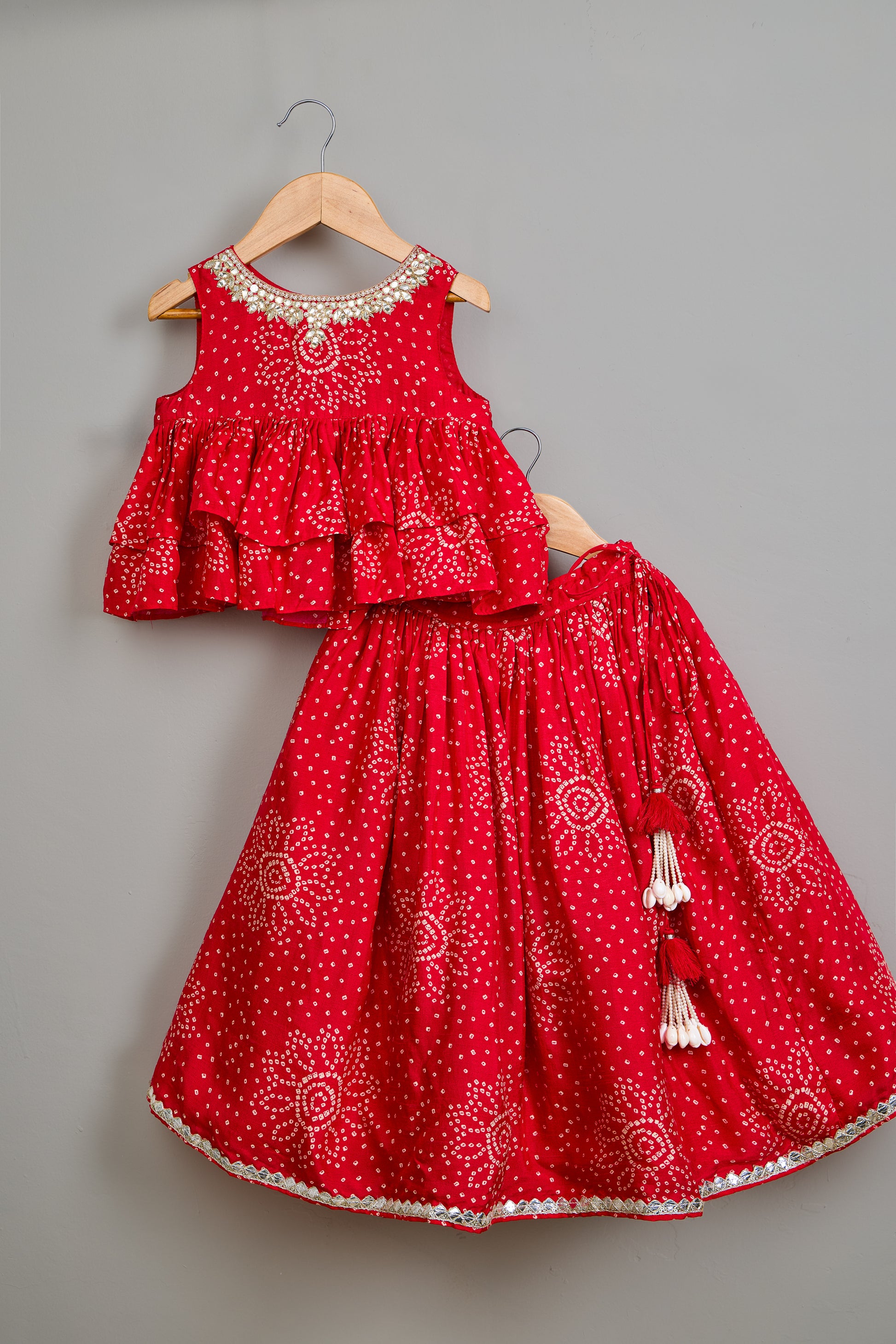 Red Printed Embroidered Layered Top And Flared Lehenga