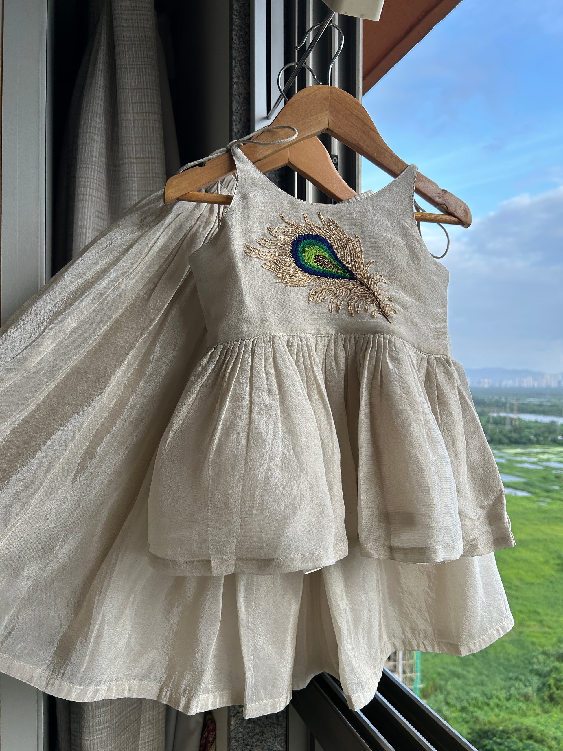 Shimmer top with Mor Pankh embroidery on the yoke and pearl-adorned tie-up shoulder straps, finished with a back hook closure. Paired with flared palazzos featuring an elasticated waist.