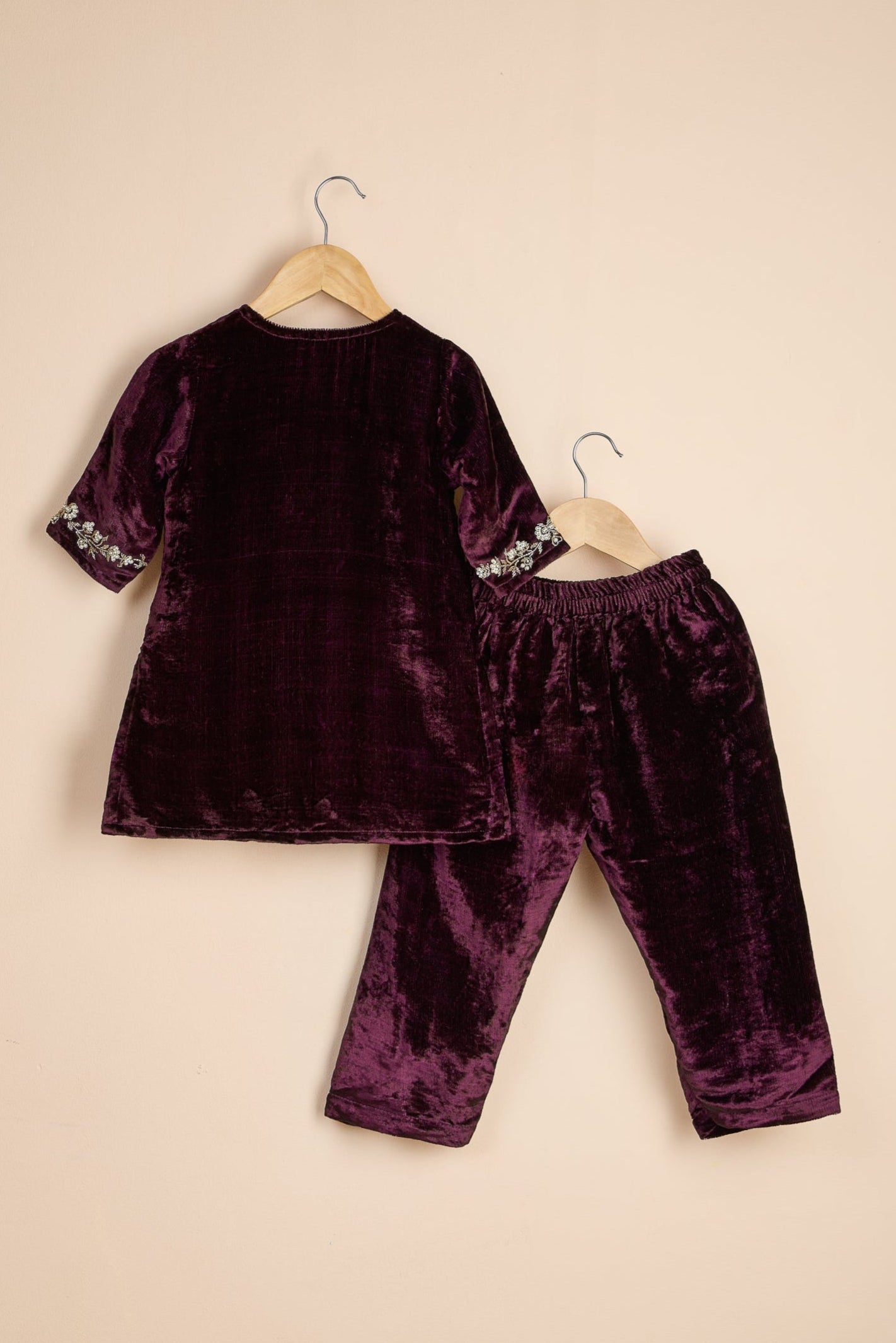 This elegant set features a velvet kurti adorned with intricate zardozi handwork embroidery on the front and sleeve openings, complemented by a round neckline and side slits. The kurti is designed with convenient front hooks for closure. Kurti paired with elasticated waist pants.